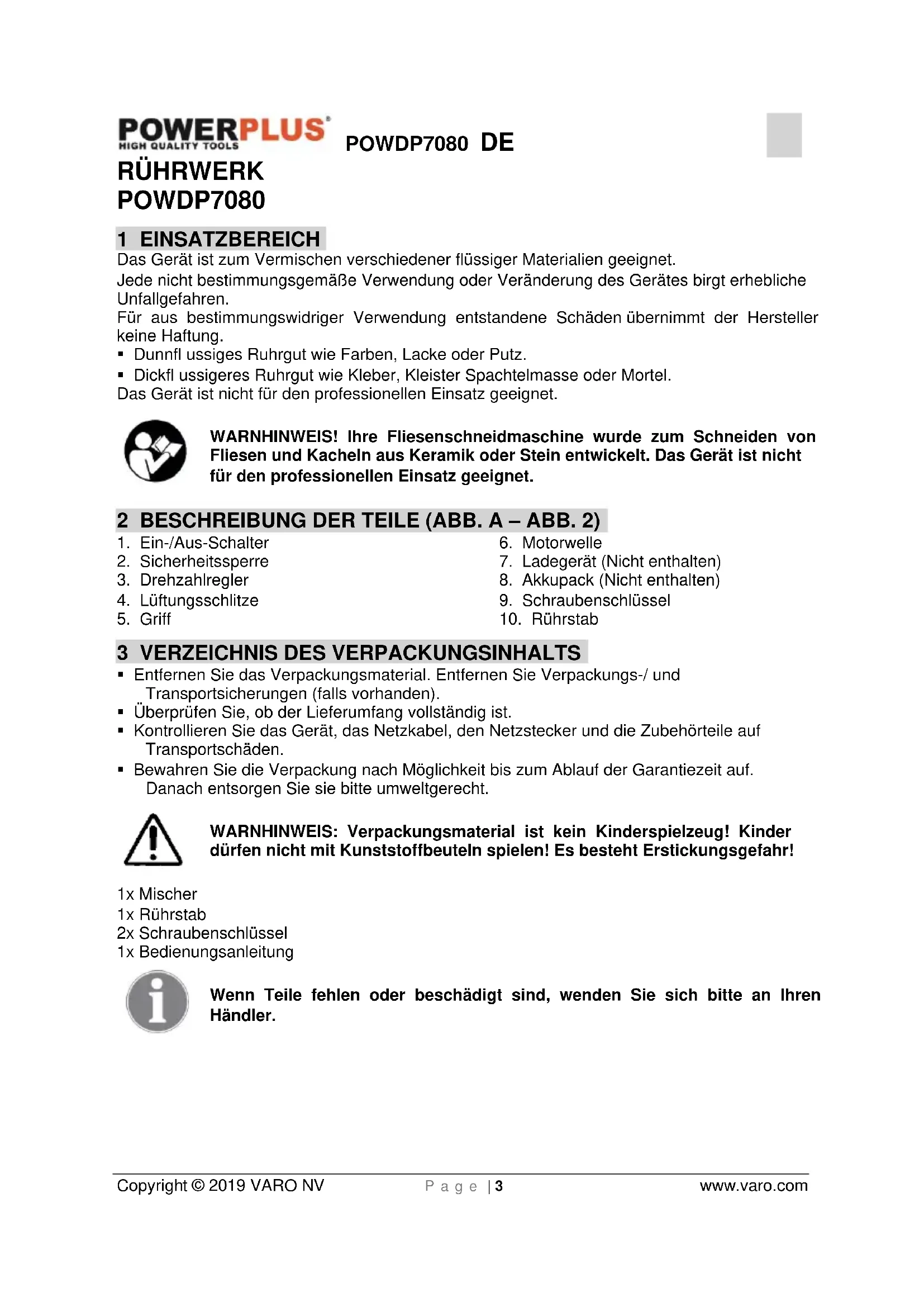 Copyright © 2019 VARO NV P a g e | 3 www.varo.com RÜHRWERK POWDP7080 1 EINSATZBEREICH Das Gerät ist zum Vermischen verschiedener flüssiger Materialien geeignet. Jede nicht bestimmungsgemäße Verwendung oder Veränderung des Gerätes birgt erhebliche Unfallgefahren. Für aus bestimmungswidriger Verwendung entstandene Schäden übernimmt der Hersteller keine Haftung.