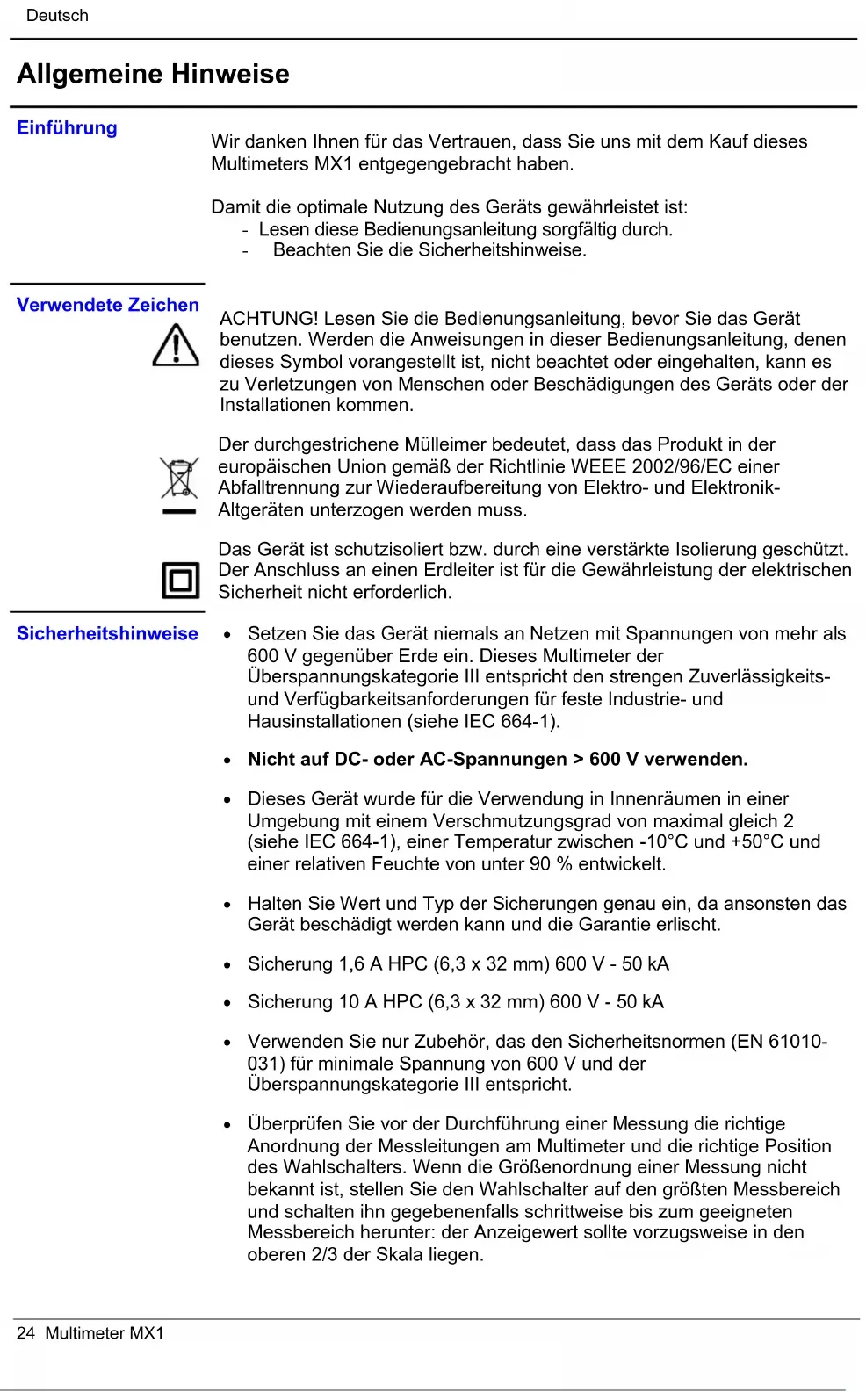Wir danken Ihnen für das Vertrauen, dass Sie uns mit dem Kauf dieses Multimeters MX1 entgegengebracht haben. Damit die optimale Nutzung des Geräts gewährleistet ist: - Lesen diese Bedienungsanleitung sorgfältig durch. - Beachten Sie die Sicherheitshinweise.