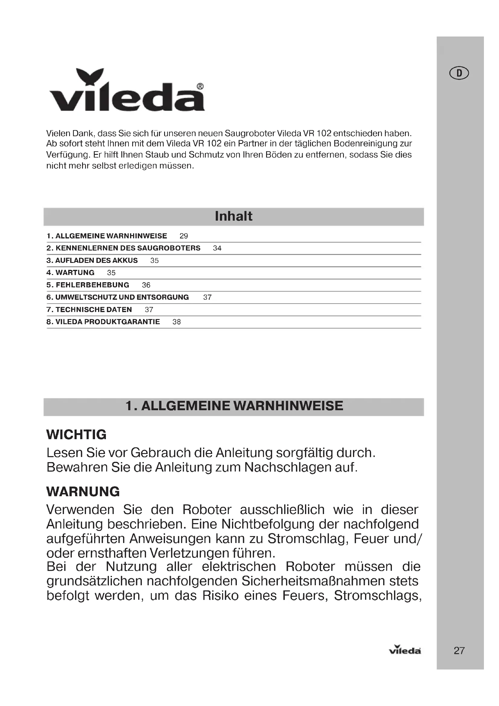 WICHTIG Lesen Sie vor Gebrauch die Anleitung sorgfältig durch. Bewahren Sie die Anleitung zum Nachschlagen auf. WARNUNG Verwenden Sie den Roboter ausschließlich wie in dieser Anleitung beschrieben. Eine Nichtbefolgung der nachfolgend aufgeführten Anweisungen kann zu Stromschlag, Feuer und/ oder ernsthaften Verletzungen führen. Bei der Nutzung aller elektrischen Roboter müssen die grundsätzlichen nachfolgenden Sicherheitsmaßnahmen stets befolgt werden, um das Risiko eines Feuers, Stromschlags, Inhalt 1. ALLGEMEINE WARNHINWEISE 292. KENNENLERNEN DES SAUGROBOTERS 343. AUFLADEN DES AKKUS 354. WARTUNG 355. FEHLERBEHEBUNG 366. UMWELTSCHUTZ UND ENTSORGUNG 377. TECHNISCHE DATEN 378. VILEDA PRODUKTGARANTIE 38 Vielen Dank, dass Sie sich für unseren neuen Saugroboter Vileda VR 102 entschieden haben. Ab sofort steht Ihnen mit dem Vileda VR 102 ein Partner in der täglichen Bodenreinigung zur Verfügung. Er hilft Ihnen Staub und Schmutz von Ihren Böden zu entfernen, sodass Sie dies nicht mehr selbst erledigen müssen.28