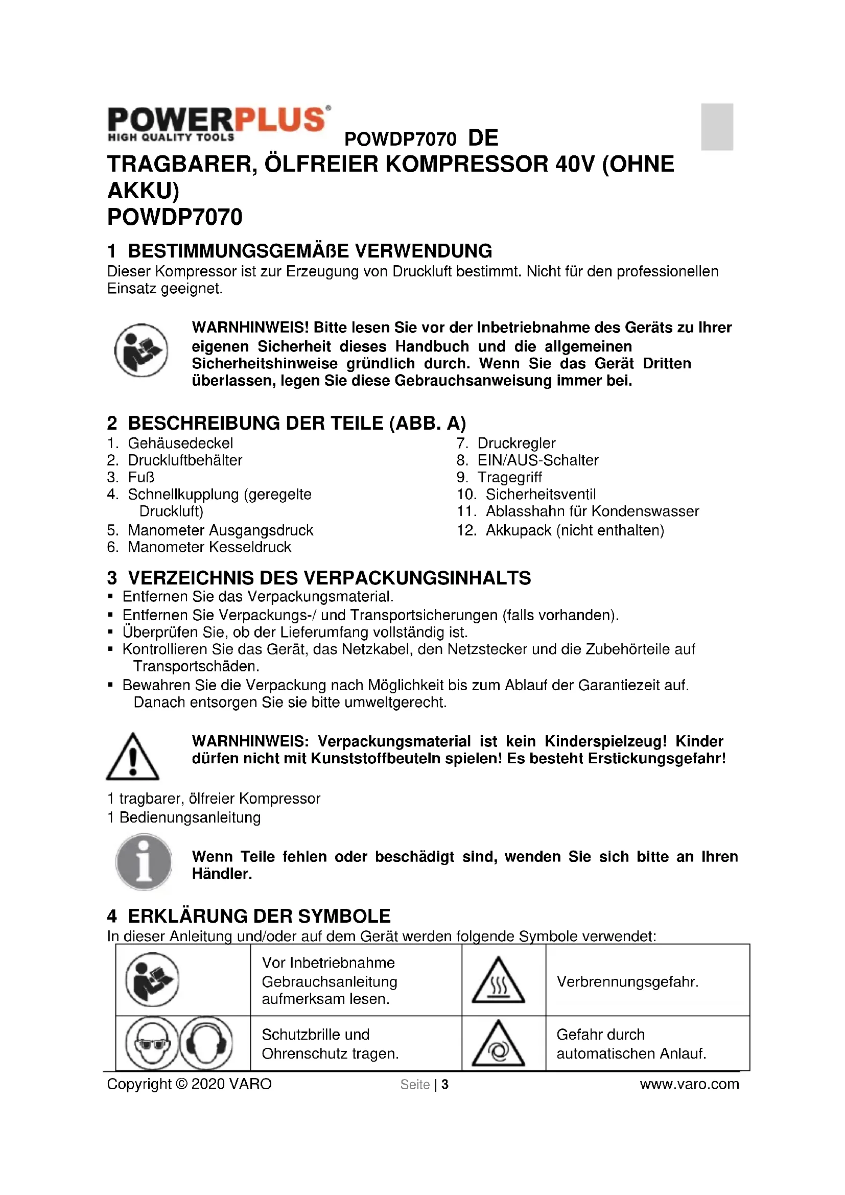 Laden Sie die Anleitung für Ihr Kompressor kostenlos im PDF-Format! Finden Sie Ihr Handbuch POWDP7070 - PowerPlus und nehmen Sie Ihr elektronisches Gerät wieder in die Hand. Auf dieser Seite sind alle Dokumente veröffentlicht, die für die Verwendung Ihres Geräts notwendig sind. POWDP7070 von der Marke PowerPlus.