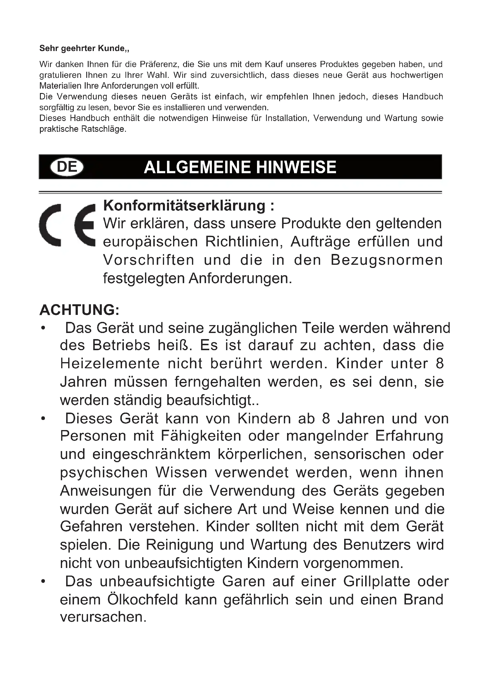- Das Gerät und seine zugänglichen Teile werden während des Betriebs heiß. Es ist darauf zu achten, dass die Heizelemente nicht berührt werden. Kinder unter 8 Jahren müssen ferngehalten werden, es sei denn, sie werden ständig beaufsichtigt..