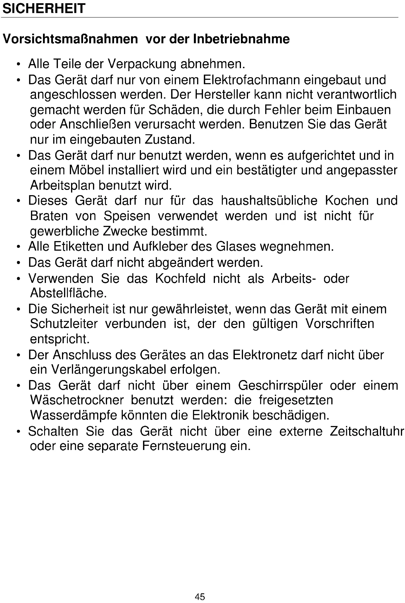 - WARNUNG: Wenn die Glasoberfläche gesprungen ist, ist das Gerät auszuschalten um die Gefahr eines elektrischen Schlages zu vermeiden. Schutz vor weiteren Gefahren