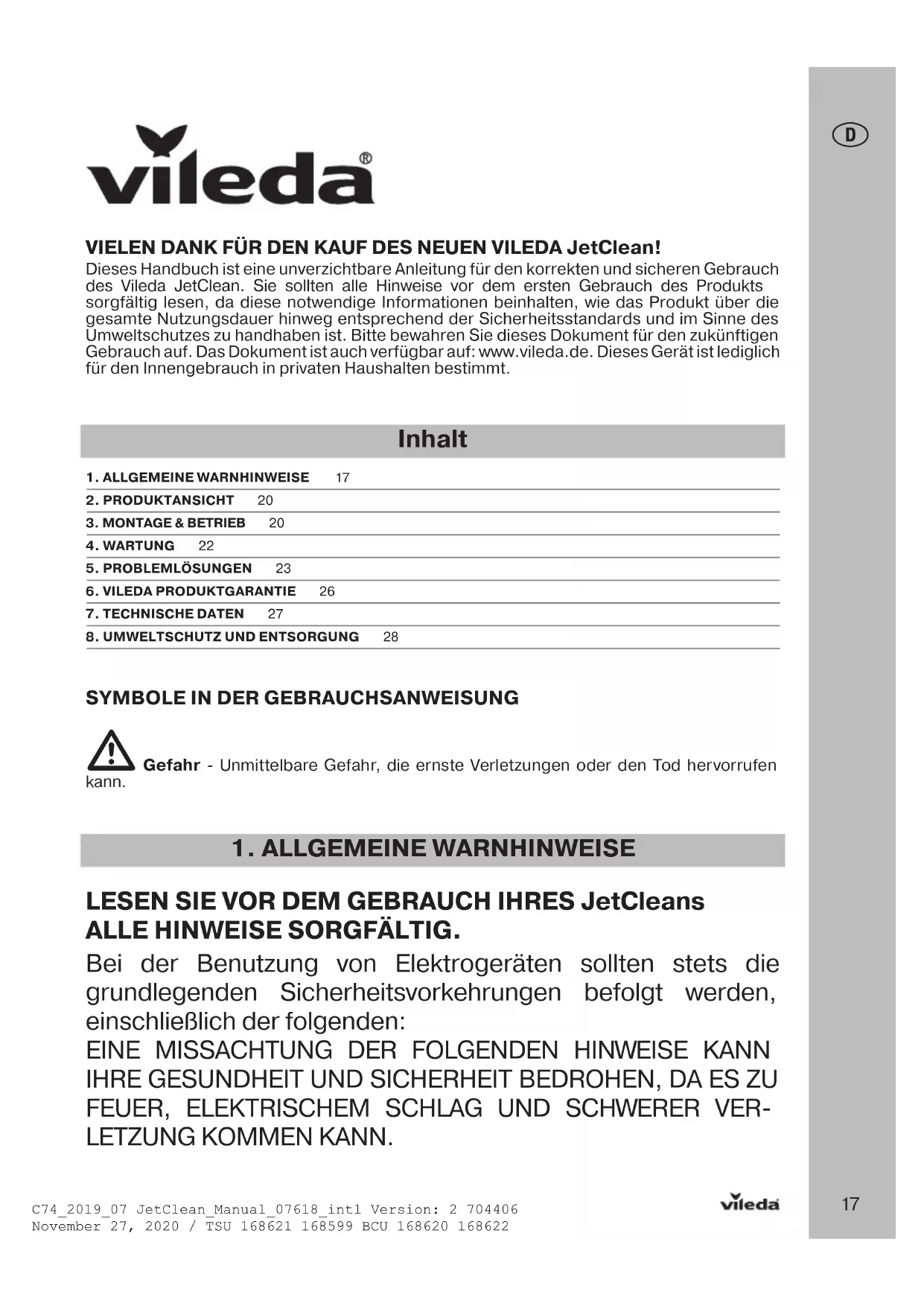 LETZUNG KOMMEN KANN. Inhalt 1. ALLGEMEINE WARNHINWEISE 172. PRODUKTANSICHT 203. MONTAGE & BETRIEB 204. WARTUNG 225. PROBLEMLÖSUNGEN 236. VILEDA PRODUKTGARANTIE 267. TECHNISCHE DATEN 278. UMWELTSCHUTZ UND ENTSORGUNG 28 VIELEN DANK FÜR DEN KAUF DES NEUEN VILEDA JetClean! Dieses Handbuch ist eine unverzichtbare Anleitung für den korrekten und sicheren Gebrauch des Vileda JetClean. Sie sollten alle Hinweise vor dem ersten Gebrauch des Produkts sorgfältig lesen, da diese notwendige Informationen beinhalten, wie das Produkt über die gesamte Nutzungsdauer hinweg entsprechend der Sicherheitsstandards und im Sinne des Umweltschutzes zu handhaben ist. Bitte bewahren Sie dieses Dokument für den zukünftigen Gebrauch auf. Das Dokument ist auch verfügbar auf: www.vileda.de. Dieses Gerät ist lediglich für den Innengebrauch in privaten Haushalten bestimmt.C74_2019_07 JetClean_Manual_07618_intl Version: 2 704406November 27, 2020 / TSU 168621 168599 BCU 168620 16862218