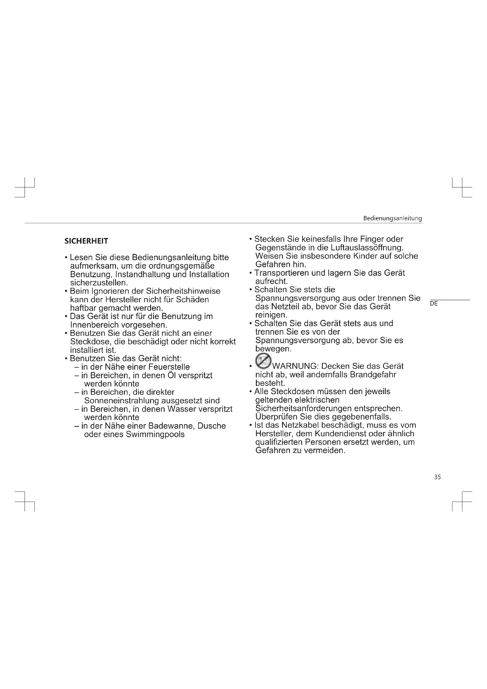 - Stecken Sie keinesfalls Ihre Finger oder Gegenstände in die Luftauslassöffnung. Weisen Sie insbesondere Kinder auf solche Gefahren hin.