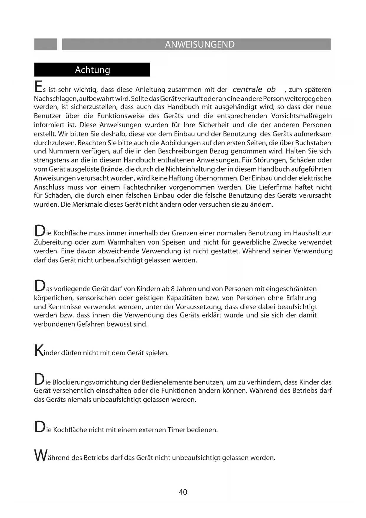 s ist sehr wichtig, dass diese Anleitung zusammen mit der centrale ob , zum späteren Nachschlagen, aufbewahrt wird. Sollte das Gerät verkauft oder an eine andere Person weitergegeben werden, ist sicherzustellen, dass auch das Handbuch mit ausgehändigt wird, so dass der neue Benutzer über die Funktionsweise des Geräts und die entsprechenden Vorsichtsmaßregeln informiert ist. Diese Anweisungen wurden für Ihre Sicherheit und die der anderen Personen erstellt. Wir bitten Sie deshalb, diese vor dem Einbau und der Benutzung des Geräts aufmerksam durchzulesen. Beachten Sie bitte auch die Abbildungen auf den ersten Seiten, die über Buchstaben und Nummern verfügen, auf die in den Beschreibungen Bezug genommen wird. Halten Sie sich strengstens an die in diesem Handbuch enthaltenen Anweisungen. Für Störungen, Schäden oder vom Gerät ausgelöste Brände, die durch die Nichteinhaltung der in diesem Handbuch aufgeführten Anweisungen verursacht wurden, wird keine Haftung übernommen. Der Einbau und der elektrische Anschluss muss von einem Fachtechniker vorgenommen werden. Die Lieferrma haftet nicht für Schäden, die durch einen falschen Einbau oder die falsche Benutzung des Geräts verursacht wurden. Die Merkmale dieses Gerät nicht ändern oder versuchen sie zu ändern.