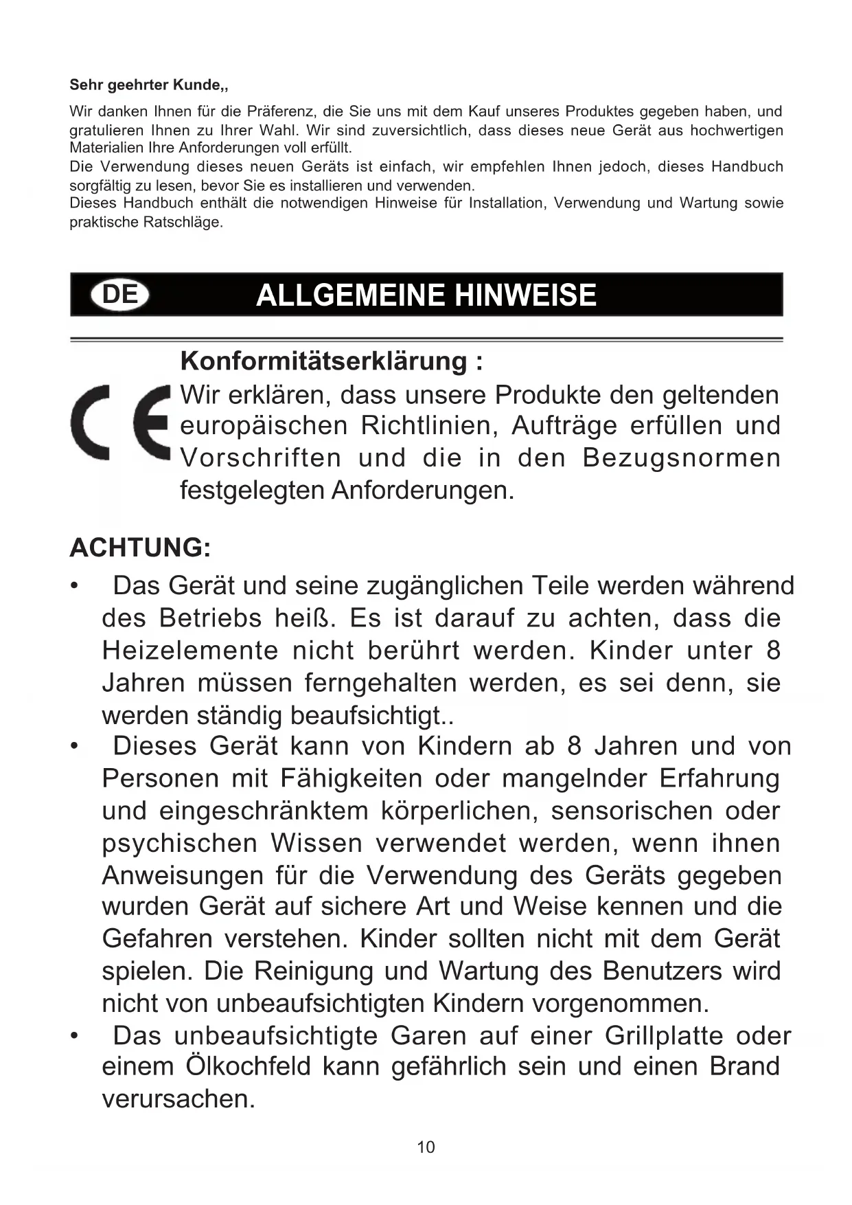 - Das Gerät und seine zugänglichen Teile werden während des Betriebs heiß. Es ist darauf zu achten, dass die Heizelemente nicht berührt werden. Kinder unter 8 Jahren müssen ferngehalten werden, es sei denn, sie werden ständig beaufsichtigt..