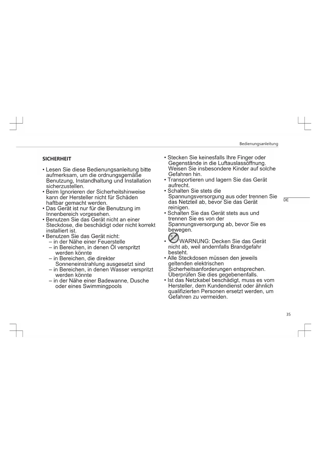 - Stecken Sie keinesfalls Ihre Finger oder Gegenstände in die Luftauslassöffnung. Weisen Sie insbesondere Kinder auf solche Gefahren hin.