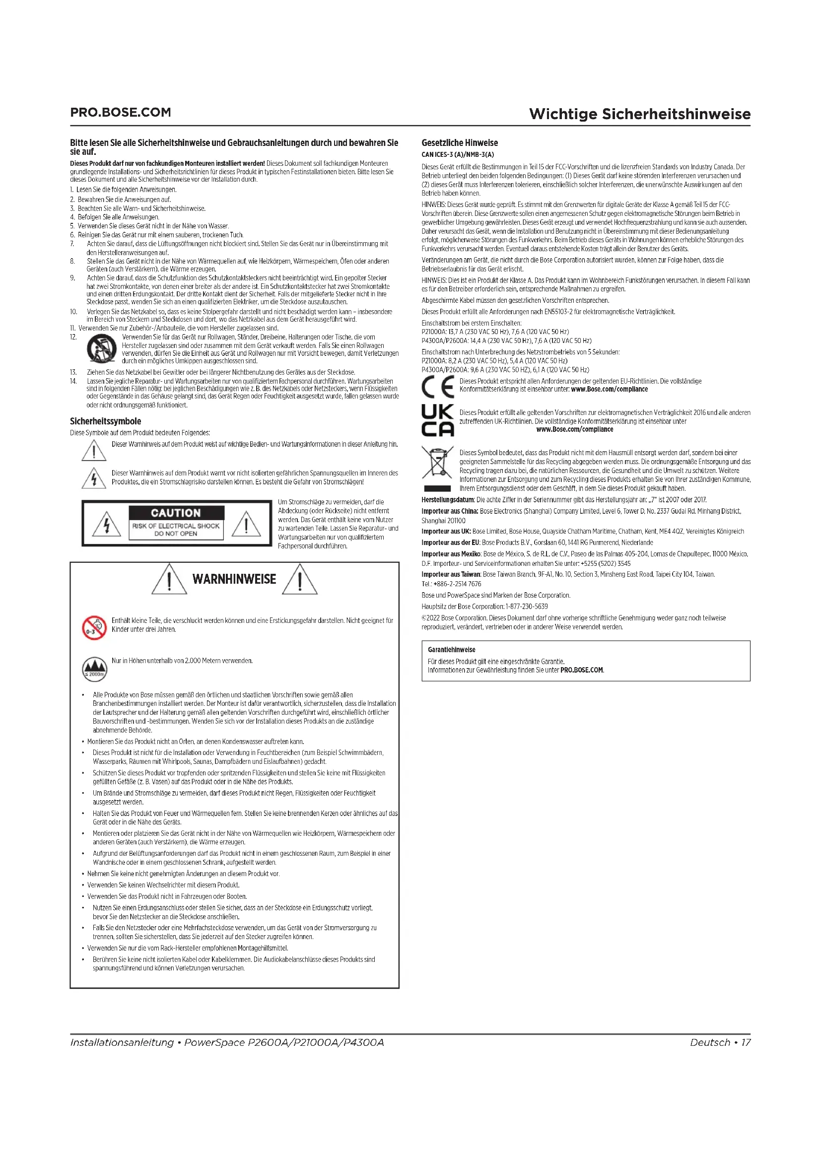 sind in folgenden Fällen nötig: bei jeglichen Beschädigungen wie z.B. des Netzkabels oder Netzsteckers, wenn Flüssigkeiten oder Gegenstände in das Gehäuse gelangt sind, das Gerät Regen oder Feuchtigkeit ausgesetzt wurde, fallen gelassen wurde oder nicht ordnungsgemäß funktioniert. Gesetzliche Hinweise CAN ICES-3 (A)/NMB-3(A) Dieses Gerät erfüllt die Bestimmungen in Teil 15 der FCC-Vorschriften und die lizenzfreien Standards von Industry Canada. Der Betrieb unterliegt den beiden folgenden Bedingungen: (1) Dieses Gerät darf keine störenden Interferenzen verursachen und (2) dieses Gerät muss Interferenzen tolerieren, einschließlich solcher Interferenzen, die unerwünschte Auswirkungen auf den Betrieb haben können. HINWEIS: Dieses Gerät wurde geprüft. Es stimmt mit den Grenzwerten für digitale Geräte der Klasse A gemäß Teil 15 der FCC- Vorschriften überein. Diese Grenzwerte sollen einen angemessenen Schutz gegen elektromagnetische Störungen beim Betrieb in gewerblicher Umgebung gewährleisten. Dieses Gerät erzeugt und verwendet Hochfrequenzstrahlung und kann sie auch aussenden. Daher verursacht das Gerät, wenn die Installation und Benutzung nicht in Übereinstimmung mit dieser Bedienungsanleitung erfolgt, möglicherweise Störungen des Funkverkehrs. Beim Betrieb dieses Geräts in Wohnungen können erhebliche Störungen des Funkverkehrs verursacht werden. Eventuell daraus entstehende Kosten trägt allein der Benutzer des Geräts. Veränderungen am Gerät, die nicht durch die Bose Corporation autorisiert wurden, können zur Folge haben, dass die Betriebserlaubnis für das Gerät erlischt. HINWEIS: Dies ist ein Produkt der KlasseA. Das Produkt kann im Wohnbereich Funkstörungen verursachen. In diesem Fall kann es für den Betreiber erforderlich sein, entsprechende Maßnahmen zu ergreifen. Abgeschirmte Kabel müssen den gesetzlichen Vorschriften entsprechen. Dieses Produkt erfüllt alle Anforderungen nach EN55103-2 für elektromagnetische Verträglichkeit. Einschaltstrom bei erstem Einschalten: P21000A: 13,7A (230VAC 50Hz), 7,6A (120VAC 50Hz) P4300A/P2600A: 14,4A (230VAC 50Hz), 7,6 A (120VAC 50Hz) Einschaltstrom nach Unterbrechung des Netzstrombetriebs von 5Sekunden: P21000A: 8,2A (230VAC 50Hz), 5,4A (120VAC 50Hz) P4300A/P2600A: 9,6A (230VAC 50HZ), 6,1A (120VAC 50Hz) Dieses Produkt entspricht allen Anforderungen der geltenden EU-Richtlinien. Die vollständige Konformitätserklärung ist einsehbar unter: www.Bose.com/compliance Dieses Produkt erfüllt alle geltenden Vorschriften zur elektromagnetischen Verträglichkeit 2016 und alle anderen zutreenden UK-Richtlinien. Die vollständige Konformitätserklärung ist einsehbar unter www.Bose.com/compliancewww.Bose.com/compliance Dieses Symbol bedeutet, dass das Produkt nicht mit dem Hausmüll entsorgt werden darf, sondern bei einer geeigneten Sammelstelle für das Recycling abgegeben werden muss. Die ordnungsgemäße Entsorgung und das Recycling tragen dazu bei, die natürlichen Ressourcen, die Gesundheit und die Umwelt zu schützen. Weitere Informationen zur Entsorgung und zum Recycling dieses Produkts erhalten Sie von Ihrer zuständigen Kommune, Ihrem Entsorgungsdienst oder dem Geschäft, in dem Sie dieses Produkt gekauft haben. Herstellungsdatum: Die achte Zier in der Seriennummer gibt das Herstellungsjahr an: „7“ ist 2007 oder 2017. Importeur aus China: Bose Electronics (Shanghai) Company Limited, Level 6, Tower D, No. 2337 Gudai Rd. Minhang District, Shanghai 201100 Importeur aus UK: Bose Limited, Bose House, Quayside Chatham Maritime, Chatham, Kent, ME4 4QZ, Vereinigtes Königreich Importeur aus der EU: Bose Products B.V., Gorslaan 60, 1441 RG Purmerend, Niederlande Importeur aus Mexiko: Bose de México, S. de R.L. de C.V., Paseo de las Palmas 405-204, Lomas de Chapultepec, 11000México, D.F. Importeur- und Serviceinformationen erhalten Sie unter: +5255 (5202) 3545 Importeur aus Taiwan: Bose Taiwan Branch, 9F-A1, No. 10, Section 3, Minsheng East Road, Taipei City 104, Taiwan. Tel.: +886-2-2514 7676 Bose und PowerSpace sind Marken der Bose Corporation. Hauptsitz der Bose Corporation: 1-877-230-5639 ©2022 Bose Corporation. Dieses Dokument darf ohne vorherige schriftliche Genehmigung weder ganz noch teilweise reproduziert, verändert, vertrieben oder in anderer Weise verwendet werden. Garantiehinweise Für dieses Produkt gilt eine eingeschränkte Garantie. Informationen zur Gewährleistung finden Sie unter PRO.BOSE.COM. WARNHINWEISE Enthält kleine Teile, die verschluckt werden können und eine Erstickungsgefahr darstellen. Nicht geeignet für Kinder unter drei Jahren. Nur in Höhen unterhalb von 2.000Metern verwenden.