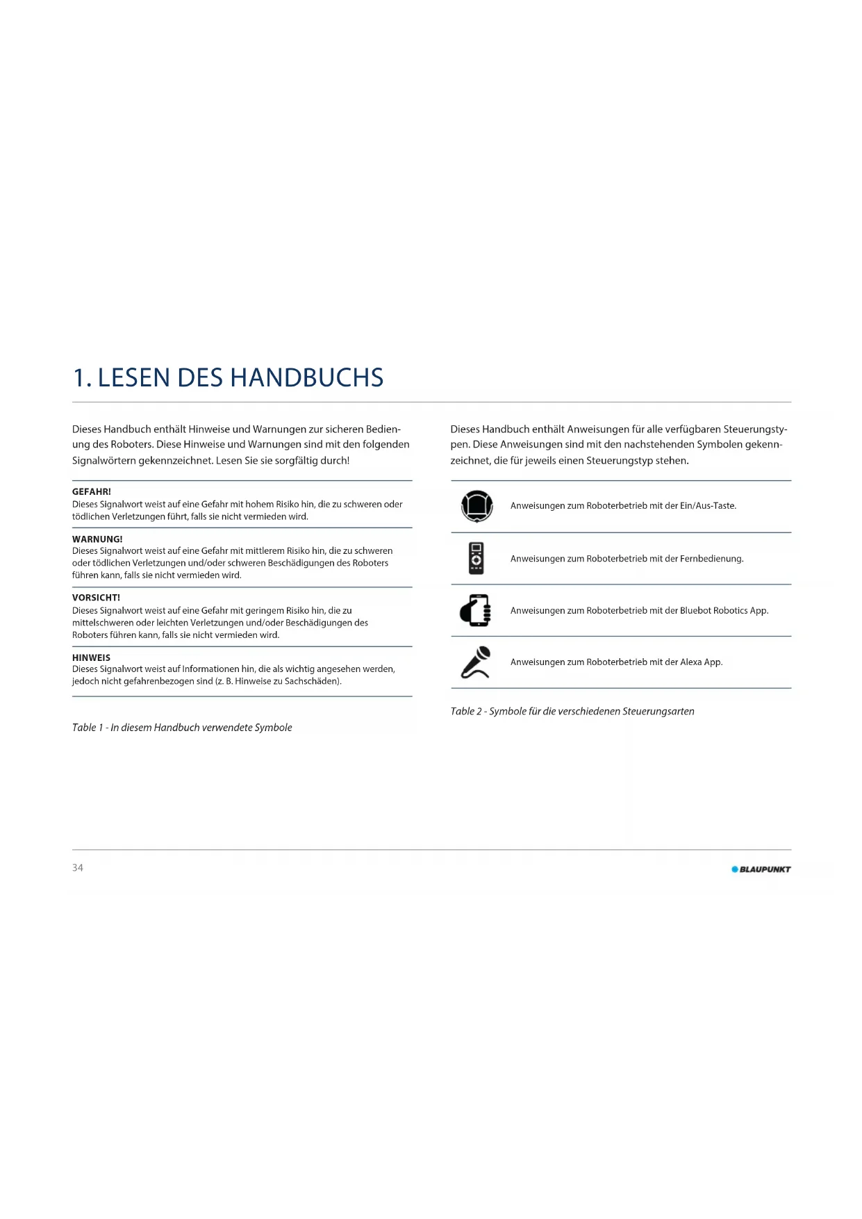 Dieses Handbuch enthält Hinweise und Warnungen zur sicheren Bedien- ung des Roboters. Diese Hinweise und Warnungen sind mit den folgenden Signalwörtern gekennzeichnet. Lesen Sie sie sorgfältig durch! GEFAHR! Dieses Signalwort weist auf eine Gefahr mit hohem Risiko hin, die zu schweren oder tödlichen Verletzungen führt, falls sie nicht vermieden wird. WARNUNG! Dieses Signalwort weist auf eine Gefahr mit mittlerem Risiko hin, die zu schweren oder tödlichen Verletzungen und/oder schweren Beschädigungen des Roboters führen kann, falls sie nicht vermieden wird. VORSICHT! Dieses Signalwort weist auf eine Gefahr mit geringem Risiko hin, die zu mittelschweren oder leichten Verletzungen und/oder Beschädigungen des Roboters führen kann, falls sie nicht vermieden wird. HINWEIS Dieses Signalwort weist auf Informationen hin, die als wichtig angesehen werden, jedoch nicht gefahrenbezogen sind (z. B. Hinweise zu Sachschäden). Table 1 - In diesem Handbuch verwendete Symbole Dieses Handbuch enthält Anweisungen für alle verfügbaren Steuerungsty- pen. Diese Anweisungen sind mit den nachstehenden Symbolen gekenn- zeichnet, die für jeweils einen Steuerungstyp stehen. Anweisungen zum Roboterbetrieb mit der Ein/Aus-Taste. Anweisungen zum Roboterbetrieb mit der Fernbedienung. Anweisungen zum Roboterbetrieb mit der Bluebot Robotics App. Anweisungen zum Roboterbetrieb mit der Alexa App. Table 2 - Symbole für die verschiedenen Steuerungsarten35