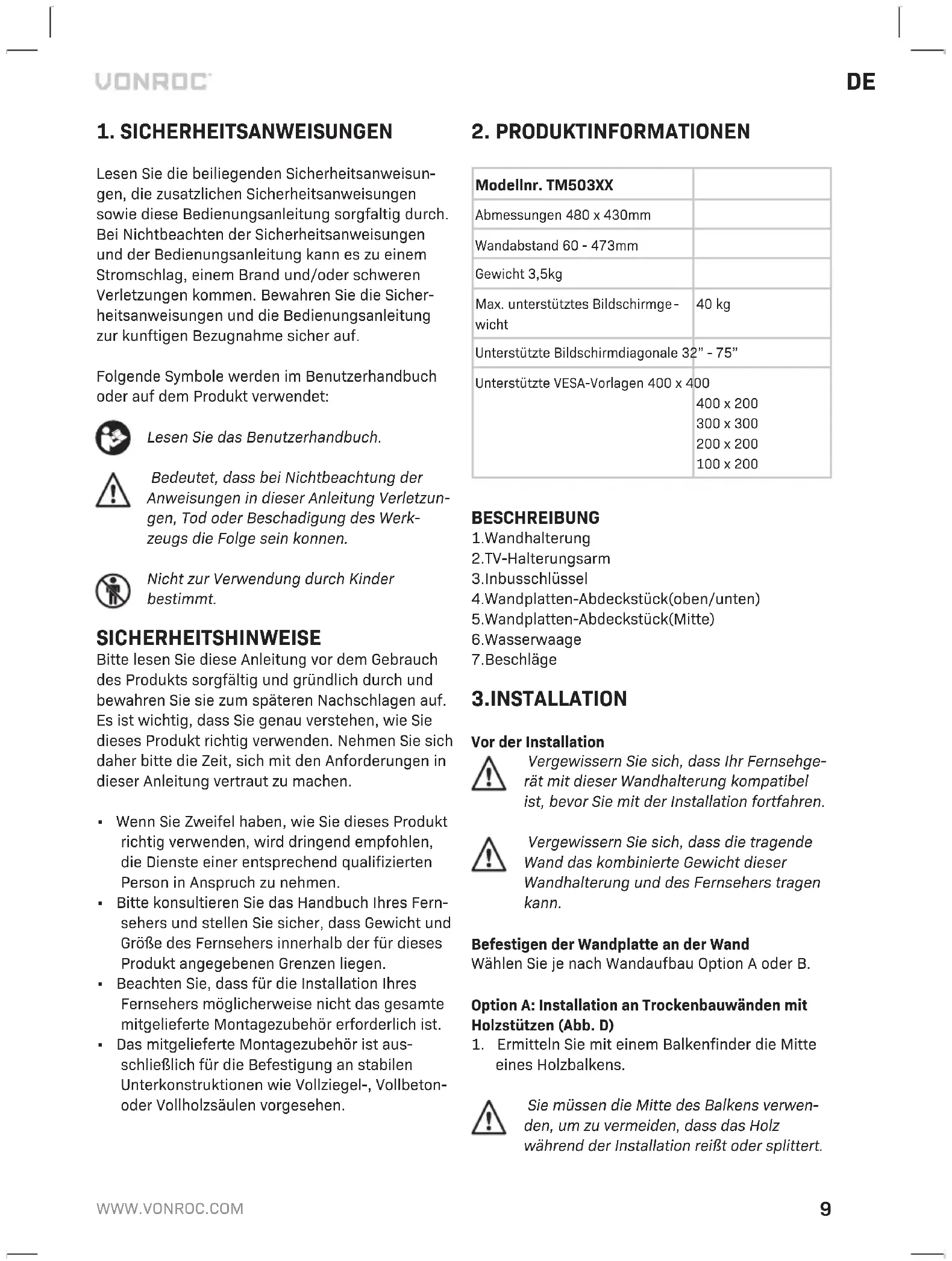 Laden Sie die Anleitung für Ihr TV-Möbel kostenlos im PDF-Format! Finden Sie Ihr Handbuch TM503XX - Vonroc und nehmen Sie Ihr elektronisches Gerät wieder in die Hand. Auf dieser Seite sind alle Dokumente veröffentlicht, die für die Verwendung Ihres Geräts notwendig sind. TM503XX von der Marke Vonroc.