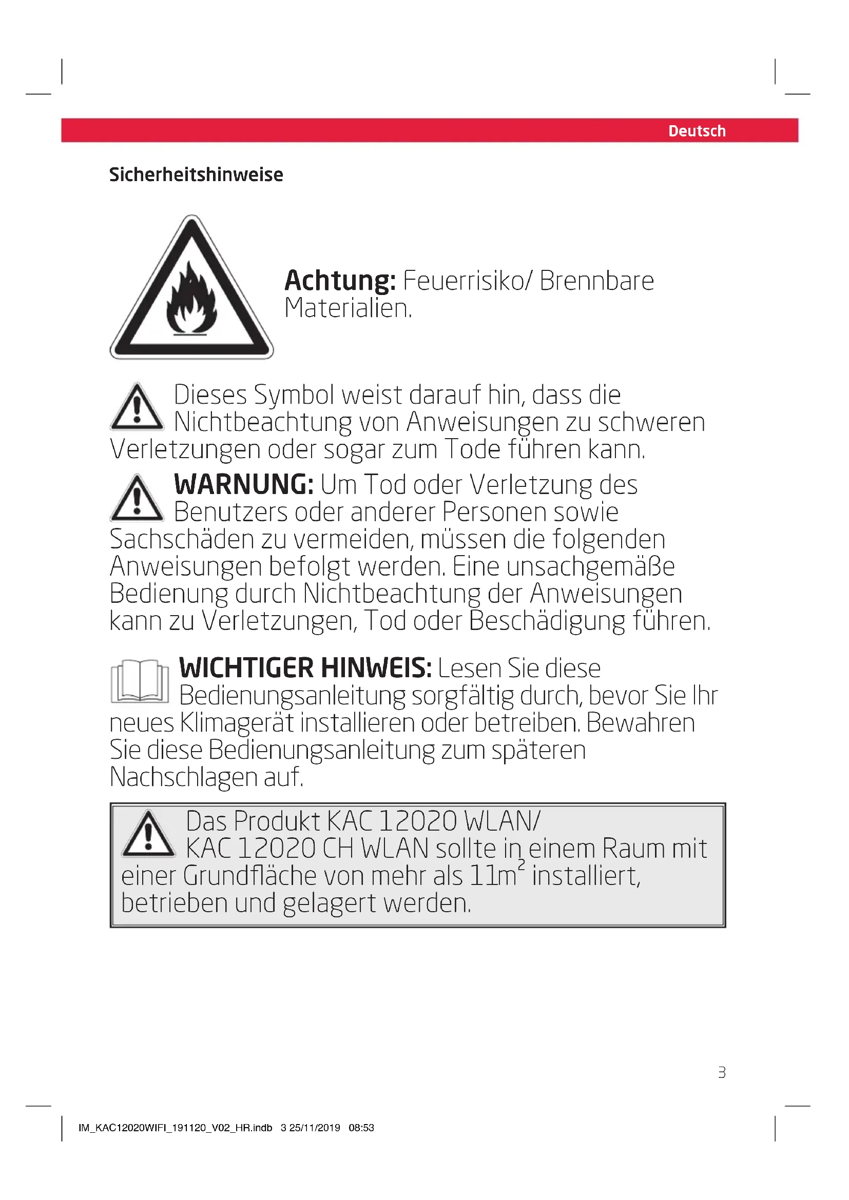 Sicherheitshinweise Achtung: Feuerrisiko/ Brennbare Materialien. Dieses Symbol weist darauf hin, dass die Nichtbeachtung von Anweisungen zu schweren Verletzungen oder sogar zum Tode führen kann. WARNUNG: Um Tod oder Verletzung des Benutzers oder anderer Personen sowie Sachschäden zu vermeiden, müssen die folgenden Anweisungen befolgt werden. Eine unsachgemäße Bedienung durch Nichtbeachtung der Anweisungen kann zu Verletzungen, Tod oder Beschädigung führen. WICHTIGER HINWEIS: Lesen Sie diese Bedienungsanleitung sorgfältig durch, bevor Sie Ihr neues Klimagerät installieren oder betreiben. Bewahren Sie diese Bedienungsanleitung zum späteren Nachschlagen auf. Das Produkt KAC 3232/ KAC 3232 CH sollte in einem Raum mit einer Grundfläche von mehr als 10 m² installiert, betrieben und gelagert werden. Das Produkt KAC 3352/ KAC 3352 CH sollte in einem Raum mit einer Grundfläche von mehr als 11 m² installiert, betrieben und gelagert werden. Das Produkt KAC 12020 WLAN/ KAC 12020 CH WLAN sollte in einem Raum mit einer Grundfläche von mehr als 1 m² installiert, betrieben und gelagert werden. IM_KAC12020WIFI_191120_V02_HR.indb 3 25/11/2019 08:53 1Deutsch
