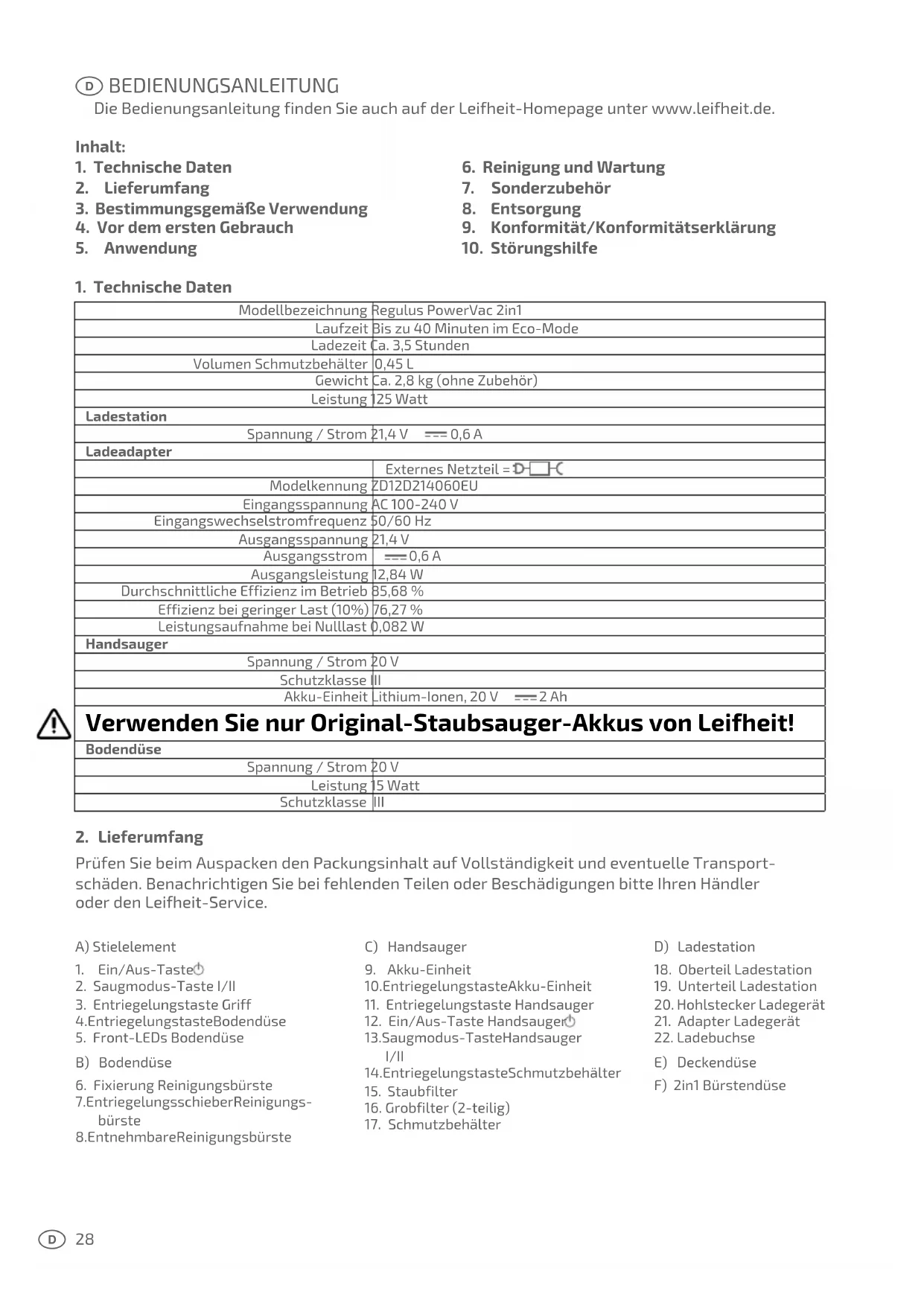 Modellbezeichnung Regulus PowerVac 2in1Laufzeit Bis zu 40 Minuten im Eco-ModeLadezeit Ca. 3,5 StundenVolumen Schmutzbehälter 0,45 LGewicht Ca. 2,8 kg (ohne Zubehör) Leistung 125 WattLadestation Spannung / Strom 21,4 V 0,6 ALadeadapter Externes Netzteil = Modelkennung ZD12D214060EUEingangsspannung AC 100-240 VEingangswechselstromfrequenz 50/60 HzAusgangsspannung 21,4 VAusgangsstrom 0,6 AAusgangsleistung 12,84 WDurchschnittliche Effizienz im Betrieb 85,68 %Effizienz bei geringer Last (10%) 76,27 %Leistungsaufnahme bei Nulllast 0,082 WHandsaugerSpannung / Strom 20 VSchutzklasse IIIAkku-Einheit Lithium-Ionen, 20 V 2 Ah Verwenden Sie nur Original-Staubsauger-Akkus von Leifheit! Bodendüse Spannung / Strom 20 V Leistung 15 WattSchutzklasse III
