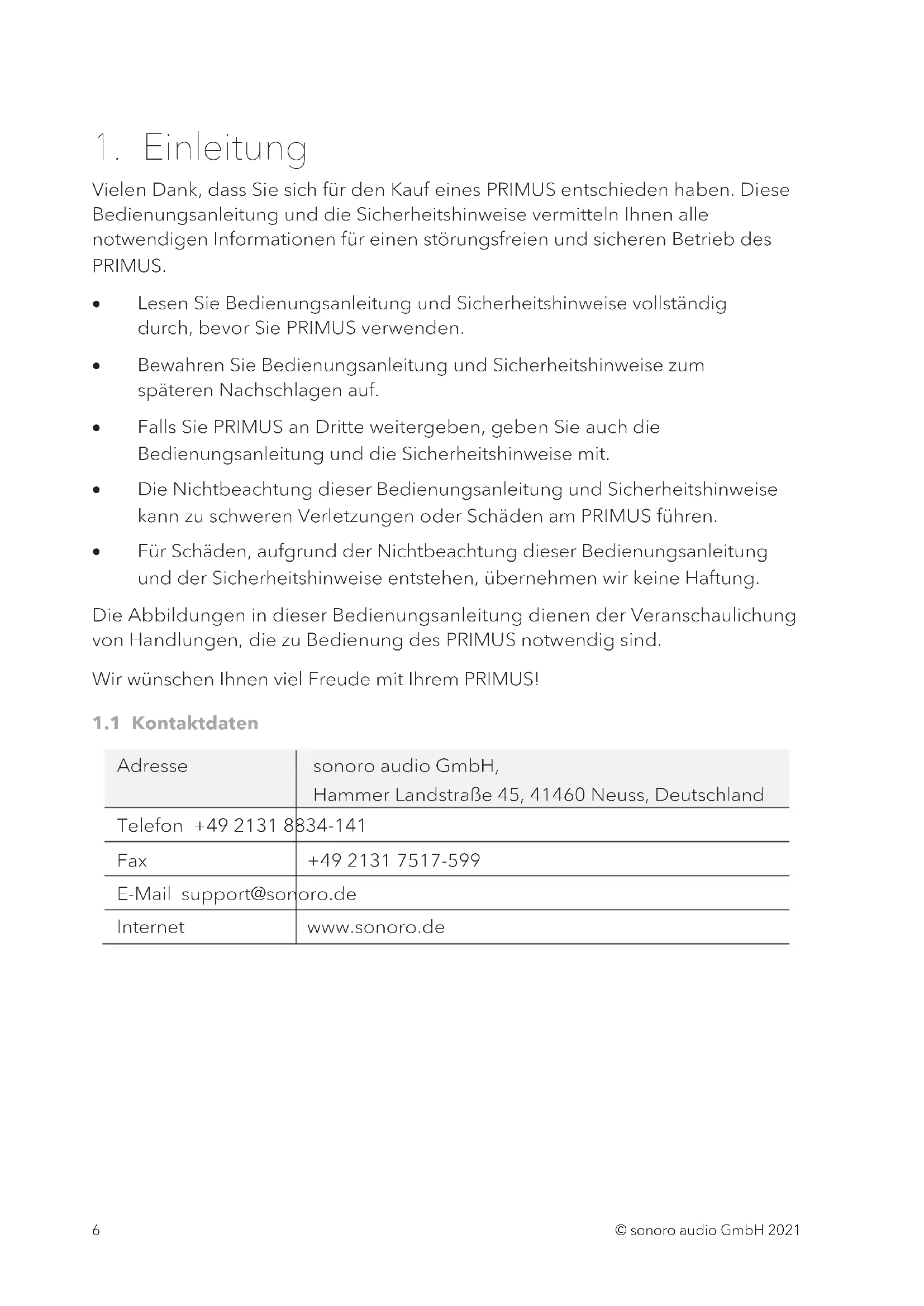Garantien omfatter ikke batterier, skader forårsaget af forkert brug, normal slitage, samt defekter der kun minimalt påvirker værdien eller brugbarheden af PRIMUS. Garantien bortfalder også i tilfælde af ændringer, der ikke er foretaget af vores autoriserede servicecenter.sonoro.deDEUTSCHLAND - HQ +49 2131 8834141 support@sonoro.de WIR DANKEN IHNEN FÜR IHR VERTRAUEN Bei der Entwicklung und Produktion unserer Musiksysteme legen wir größten Wert auf Qualität und höchstmögliche Sorgfalt. Dazu gehört auch, dass jedes einzelne Musiksystem vor dem Verlassen des Werkes auf Herz und Nieren geprüft wird. Es ist uns daher besonders wichtig, dass Sie nach dem Kauf noch lange Freude an Ihrem sonoro Musiksystem haben. Ist der Inhalt unvollständig oder beschädigt? Gibt es Anlass zu Beanstandungen? Wir lassen Sie mit Ihren Fragen nicht allein. Verlassen Sie sich auf das Know-how unserer Service-Mitarbeiter. Unser Service-Team weiß alles, was es über die sonoro Produkte zu wissen gibt und berät Sie freundlich, schnell und kompetent.