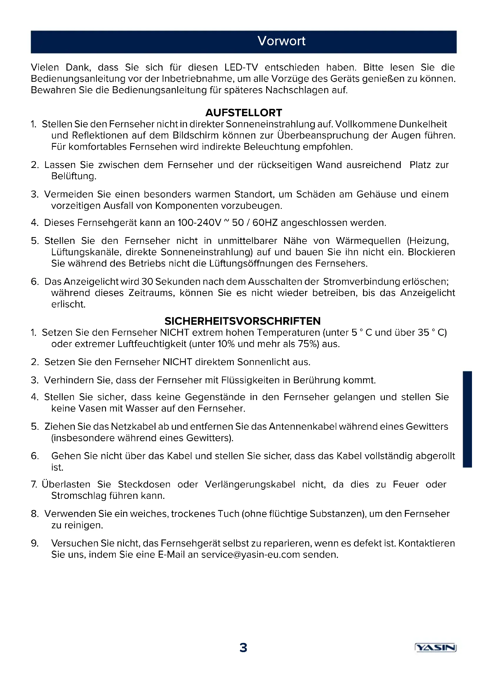 Sie uns, indem Sie eine E-Mail an service@yasin-eu.com senden.4 tekstWARNHINWEISE VORSICHT! ZUR VERMEIDUNG VON STROMSCHLAG. GEHÄUSE NICHT ÖFFNEN. ES BEFINDEN SICH KEINE VOM VERBRAUCHER AUSTAUSCHBAREN TEILE IM GERÄT. WENDEN SIE SICH MIT REPARATUREN STETS AN EINEN. AUTORISIERTEN KUNDENDIENST. Der Blitz im gleichseitigen Dreieck weist auf gefährliche Hochspannung im Gerät hin, die zu Stromschlag führen kann. Das Ausrufungszeichen im gleichseitigen Dreieck weist auf wichtige Bedienungs- und Wartungsanleitungen hin. Ein Gerät der Klasse I muss an einer geerdeten Steckdose angeschlossen werden. Wird der Netzstecker oder das Anschlusskabel zum Trennen des Geräts vom Stromnetz verwendet, so müssen sie während des Betriebs stets frei zugänglich sein. VORSICHT STROMSCHLAGGEFAHR NICHT ÖFFNEN5 tekstSICHERHEITSHINWEISE Warnung Hochspannung im Gerät. Gehäuse nicht önen. Wenden Sie sich mit. Reparaturen stets an einen autorisierten Kundendienst. Warnung Zur Vermeidung von Feuer und Stromschlag setzen Sie das Gerät nicht Feuchtigkeit aus und stellen Sie keine mit Wasser gefüllten Gegenstände (wie Vasen) auf dem Gerät ab. Warnung Führen Sie keine Fremdkörper in das Gerät ein. Verschütten Sie keine Flüssigkeiten auf dem Gerät. Warnung Setzen Sie das Gerät keiner direkten Sonneneinstrahlung oder Wärmequellen aus. Stellen Sie den Fernseher nicht auf anderen Geräten ab, die Wärme abgeben (Videorekorder, Verstärker usw.). Blockieren Sie nicht die Lüftungsönungen, um elektronische Komponenten nicht vorzeigitg altern zu lassen. Knicken Sie das Netzkabel nicht und stellen Sie keine schweren Gegenstände darauf ab.