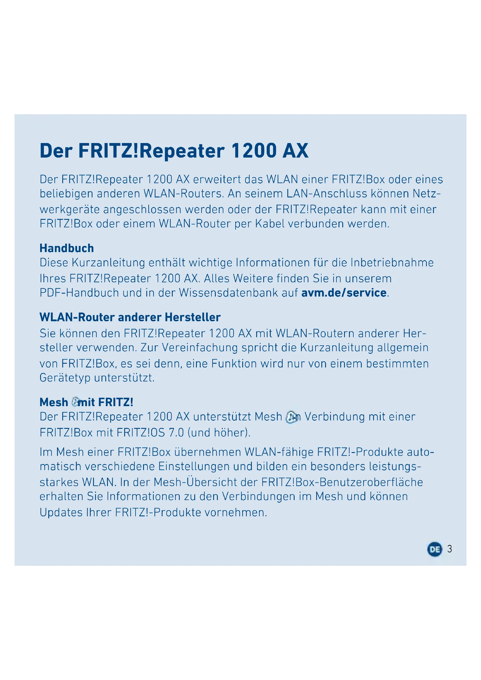 Quick Start Guide Repeater 1200 AXDEUTSCH 3 ENGLISH 15 FRANÇAIS 27 ESPAÑOL 39 ITALIANO 51 NEDERLANDS 63Der FRITZ!Repeater1200AX Der FRITZ!Repeater1200AX erweitert das WLAN einer FRITZ!Box oder eines beliebigen anderen WLAN-Routers. An seinem LAN-Anschluss können Netz- werkgeräte angeschlossen werden oder der FRITZ!Repeater kann mit einer FRITZ!Box oder einem WLAN-Router per Kabel verbunden werden. Handbuch Diese Kurzanleitung enthält wichtige Informationen für die Inbetriebnahme Ihres FRITZ!Repeater1200AX. Alles Weitere nden Sie in unserem PDF-Handbuch und in der Wissensdatenbank auf avm.de/service. WLAN-Router anderer Hersteller Sie können den FRITZ!Repeater1200AX mit WLAN-Routern anderer Her- steller verwenden. Zur Vereinfachung spricht die Kurzanleitung allgemein von FRITZ!Box, es sei denn, eine Funktion wird nur von einem bestimmten Gerätetyp unterstützt. Mesh mit FRITZ! Der FRITZ!Repeater1200AX unterstützt Mesh in Verbindung mit einer FRITZ!Box mit FRITZ!OS7.0 (und höher). Im Mesh einer FRITZ!Box übernehmen WLAN-fähige FRITZ!-Produkte auto- matisch verschiedene Einstellungen und bilden ein besonders leistungs- starkes WLAN. In der Mesh-Übersicht der FRITZ!Box-Benutzeroberäche erhalten Sie Informationen zu den Verbindungen im Mesh und können Updates Ihrer FRITZ!-Produkte vornehmen. 3Lieferumfang Bezeichnung Abbildung 1 FRITZ!Repeater1200AX 1 LAN-Kabel 1 Kurzanleitung ohne Abbildung Sicherheit Sicherheitshinweise für FRITZ!Repeater1200AX Handhabung Lüftungsschlitze nicht abdecken keine Flüssigkeiten ins Innere eindringen lassen nicht önen und nicht unsachgemäß reparieren vor der Reinigung vom Strom trennen Reinigung nur mit einem leicht feuchten Tuch am Standort nur an leicht erreichbare Steckdosen anschließen trockene und staubfreie Umgebung nicht im Freien verwenden 4Lieferumfang Bezeichnung Abbildung 1 FRITZ!Repeater1200AX 1 LAN-Kabel 1 Kurzanleitung ohne Abbildung Sicherheit Sicherheitshinweise für FRITZ!Repeater1200AX Handhabung Lüftungsschlitze nicht abdecken keine Flüssigkeiten ins Innere eindringen lassen nicht önen und nicht unsachgemäß reparieren vor der Reinigung vom Strom trennen Reinigung nur mit einem leicht feuchten Tuch am Standort nur an leicht erreichbare Steckdosen anschließen trockene und staubfreie Umgebung nicht im Freien verwenden 5Verbindungsmöglichkeiten Sie können den FRITZ!Repeater1200AX per WLAN oder per LAN-Kabel mit einer FRITZ!Box verbinden. WLAN-Verbindung zur FRITZ!Box, wenn LAN-Verbindung zur FRITZ!Box, wenn der FRITZ!Repeater innerhalb der WLAN-Reichweite der FRITZ!Box eingesetzt werden soll der FRITZ!Repeater außerhalb der WLAN-Reichweite der FRITZ!Box oder eines anderen Repeaters im Heimnetz eingesetzt werden soll ein Netzwerkgerät ohne WLAN am LAN-Anschluss des Repeaters ins Heimnetz eingebunden werden soll eine LAN-Verbindung hergestellt werden kann (zum Beispiel Hausnetzverka- belung) Info Connect/WPS Fon/DECT WLAN Power/DSL WLAN LAN Info Connect/WPS Fon/DECT WLAN Power/DSL WLAN LAN Lesen Sie weiter unter „WLAN-Verbindung einrichten“ auf Seite8. Lesen Sie weiter unter „LAN-Verbindung einrichten“ auf Seite9. Gerätemerkmale Bezeichnung Abbildung Funktion Handlung/Bedeutung Taste Connect Verbindung herstellen 1Sekunde lang drücken mit anderer Basis verbinden 6Sekunden lang drücken Werkseinstellungen laden 15Sekunden lang drücken LED leuchtet Verbindung hergestellt; die Verbindung ist gut blinkt langsam (alle 2Sekunden) nicht mit FRITZ!Box verbunden, keine WLAN-Verbindung eingerichtet schnell (2-mal pro Sekunde) Vorgang wie WPS, Neustart oder Update wird ausgeführt leuchtet Verbindung schwach blinkt Verbindung unterbrochen aus WLAN nicht aktiv; gegebenenfalls ist eine Zeitschaltung eingerichtet Buchse LAN Netzwerkgeräte per Kabel verbinden 6Verbindungsmöglichkeiten Sie können den FRITZ!Repeater1200AX per WLAN oder per LAN-Kabel mit einer FRITZ!Box verbinden. WLAN-Verbindung zur FRITZ!Box, wenn LAN-Verbindung zur FRITZ!Box, wenn der FRITZ!Repeater innerhalb der WLAN-Reichweite der FRITZ!Box eingesetzt werden soll der FRITZ!Repeater außerhalb der WLAN-Reichweite der FRITZ!Box oder eines anderen Repeaters im Heimnetz eingesetzt werden soll ein Netzwerkgerät ohne WLAN am LAN-Anschluss des Repeaters ins Heimnetz eingebunden werden soll eine LAN-Verbindung hergestellt werden kann (zum Beispiel Hausnetzverka- belung) Info Connect/WPSFon/DECT WLAN Power/DSL WLAN LAN Info Connect/WPSFon/DECT WLAN Power/DSL WLAN LAN Lesen Sie weiter unter „WLAN-Verbindung einrichten“ auf Seite8. Lesen Sie weiter unter „LAN-Verbindung einrichten“ auf Seite9. WLAN 7WLAN-Verbindung einrichten Handlung Abbildung