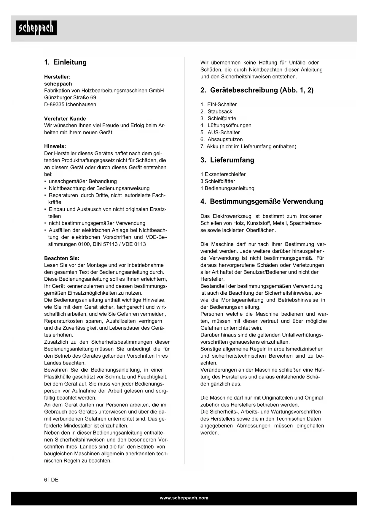Hersteller: scheppach Fabrikation von Holzbearbeitungsmaschinen GmbH Günzburger Straße 69 D-89335 Ichenhausen Verehrter Kunde Wir wünschen Ihnen viel Freude und Erfolg beim Ar- beiten mit Ihrem neuen Gerät. Hinweis: Der Hersteller dieses Gerätes haftet nach dem gel- tenden Produkthaftungsgesetz nicht für Schäden, die an diesem Gerät oder durch dieses Gerät entstehen bei: