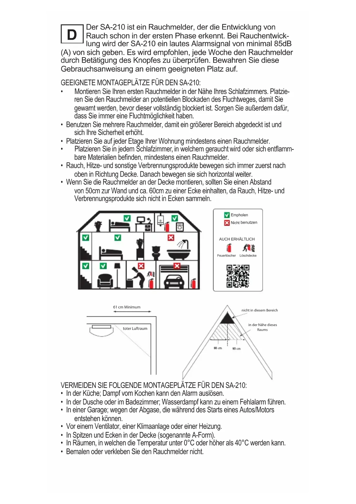 Der SA-210 ist ein Rauchmelder, der die Entwicklung von Rauch schon in der ersten Phase erkennt. Bei Rauchentwicklung wird der SA-210 ein lautes Alarmsignal von minimal 85dB