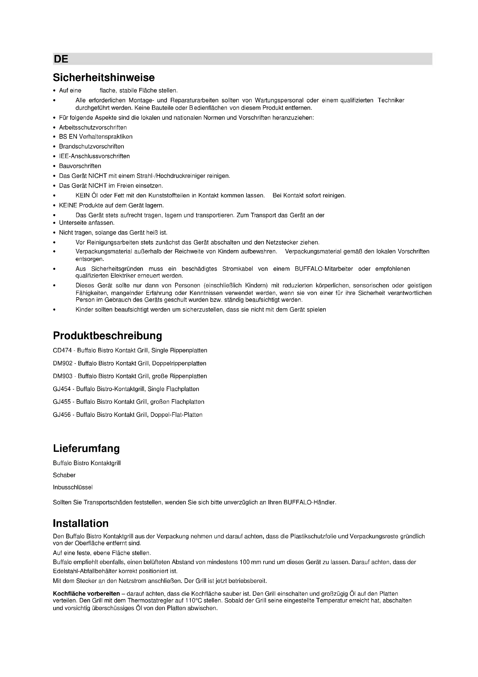 - Kinder sollten beaufsichtigt werden um sicherzustellen, dass sie nicht mit dem Gerät spielen Produktbeschreibung CD474 - Buffalo Bistro Kontakt Grill, Single Rippenplatten DM902 - Buffalo Bistro Kontakt Grill, Doppelrippenplatten DM903 - Buffalo Bistro Kontakt Grill, große Rippenplatten GJ454 - Buffalo Bistro-Kontaktgrill, Single Flachplatten GJ455 - Buffalo Bistro Kontakt Grill, großen Flachplatten GJ456 - Buffalo Bistro Kontakt Grill, Doppel-Flat-Platten Lieferumfang Buffalo Bistro Kontaktgrill Schaber Inbusschlüssel Sollten Sie Transportschäden feststellen, wenden Sie sich bitte unverzüglich an Ihren BUFFALO-Händler. Installation Den Buffalo Bistro Kontaktgrill aus der Verpackung nehmen und darauf achten, dass die Plastikschutzfolie und Verpackungsreste gründlich von der Oberfläche entfernt sind. Auf eine feste, ebene Fläche stellen. Buffalo empfiehlt ebenfalls, einen belüfteten Abstand von mindestens 100 mm rund um dieses Gerät zu lassen. Darauf achten, dass der Edelstahl-Abfallbehälter korrekt positioniert ist. Mit dem Stecker an den Netzstrom anschließen. Der Grill ist jetzt betriebsbereit. Kochfläche vorbereiten – darauf achten, dass die Kochfläche sauber ist. Den Grill einschalten und großzügig Öl auf den Platten verteilen. Den Grill mit dem Thermostatregler auf 110°C stellen. Sobald der Grill seine eingestellte Temperatur erreicht hat, abschalten und vorsichtig überschüssiges Öl von den Platten abwischen.Telefonische Helpline: 0800 1860806 DE Betrieb Der Kontaktgrill sollte mindestens 5 Minuten vor dem Gebrauch eingeschaltet werden. Um dieses Gerät effizient unregelmäßig nutzen zu können, wird empfohlen, dass die Grillplatten geschlossen bleiben und das Thermostat ausgeschaltet ist, solange das Gerät nicht benutzt wird. Dadurch wird der Stromverbrauch reduziert und der Grill heizt sich bei Bedarf schneller auf. Buffalo empfiehlt, die Grillflächen vor jedem Gebrauch leicht einzufetten. Für allgemeine Zubereitungsanwendungen reicht eine Temperatureinstellung von 200°C - 220°C aus. Diese Richtwerte gelten aber u. U. nicht für bestimmte Speisen, individuelle Anforderungen oder je nach Erfahrung mit dem Gerät. Die Speisen einfach auf die untere Grillfläche legen, die obere Platte absenken und die Speisen nach Bedarf grillen oder garen.