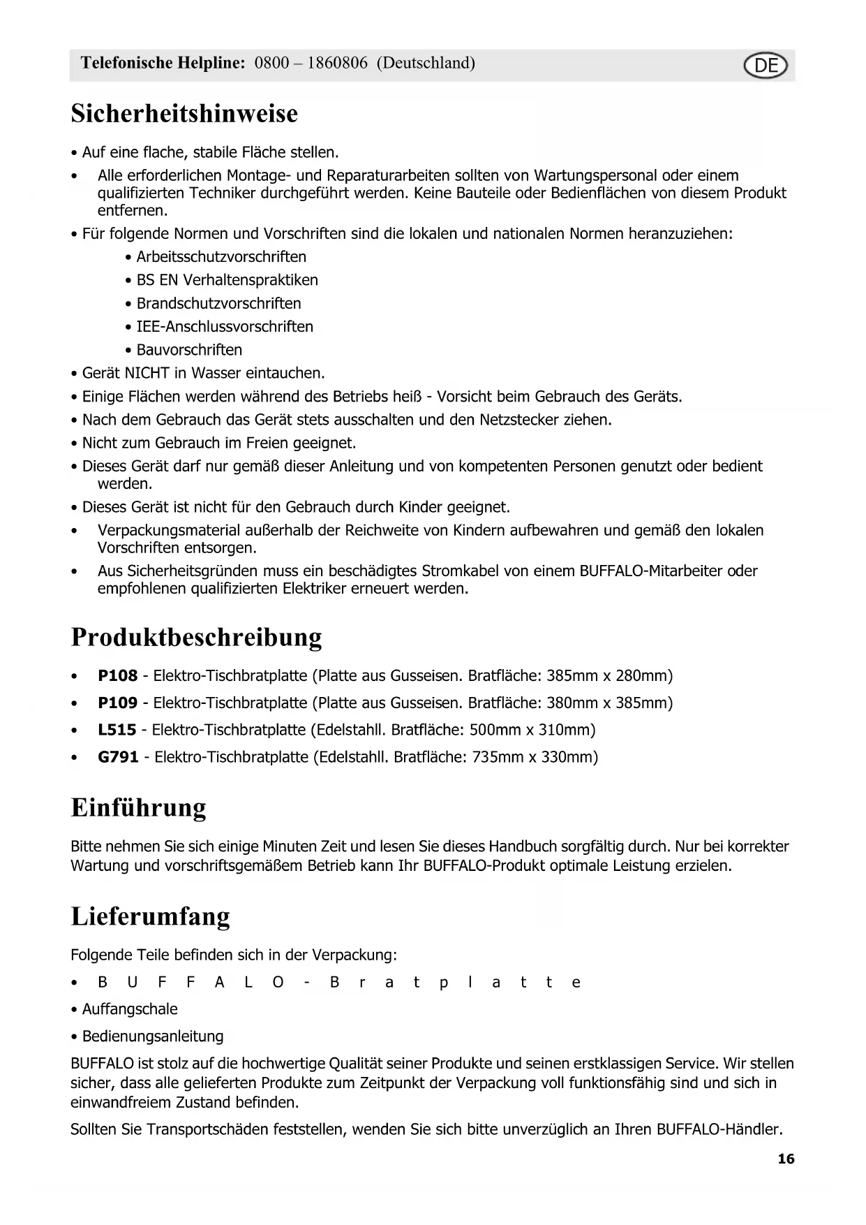 - G791 - Elektro-Tischbratplatte (Edelstahll. Bratfläche: 735mm x 330mm) Einführung Bitte nehmen Sie sich einige Minuten Zeit und lesen Sie dieses Handbuch sorgfältig durch. Nur bei korrekter Wartung und vorschriftsgemäßem Betrieb kann Ihr BUFFALO-Produkt optimale Leistung erzielen. Lieferumfang Folgende Teile befinden sich in der Verpackung:
