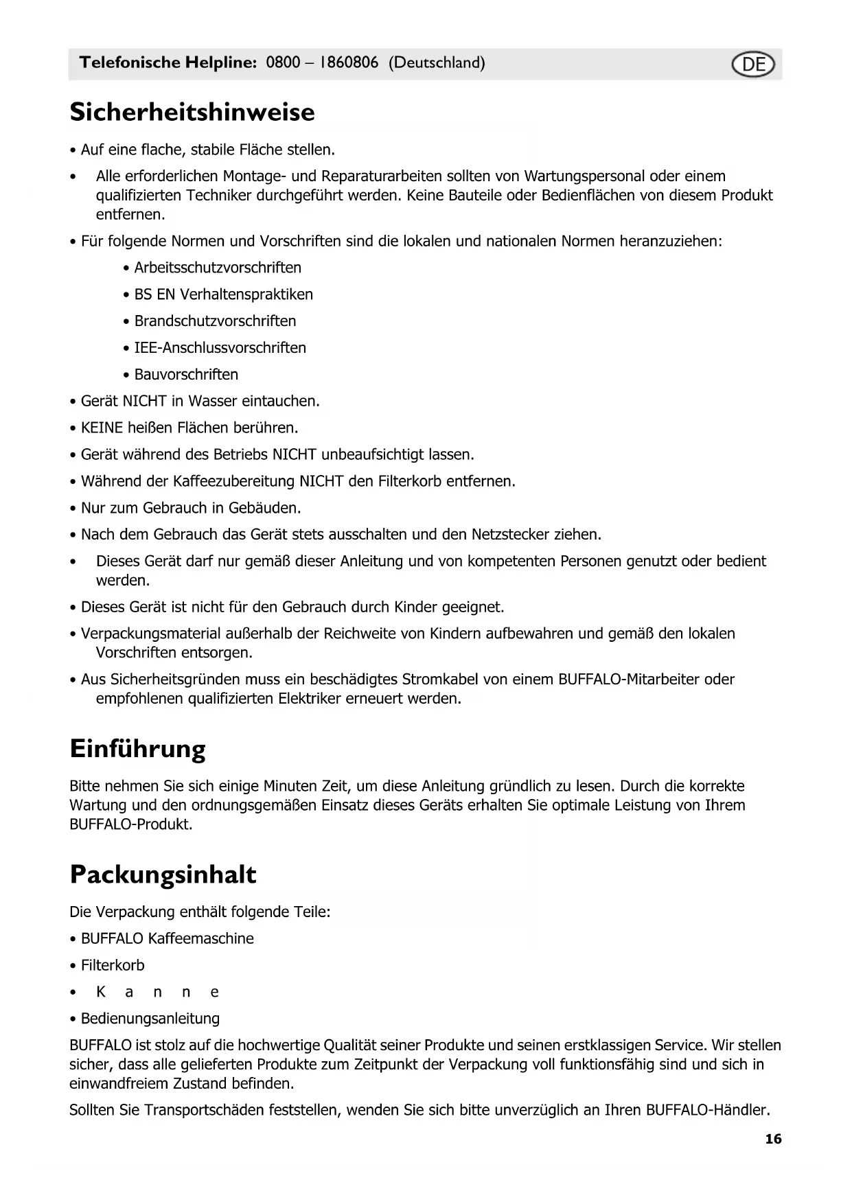 Fehlersuche Hinweis: Verwenden Sie ein geeignetes Entkalkungsmittel und beachten Sie die Gebrauchsanweisung dieses Mittels. Hinweis: In Gegenden mit harter Wasserqualität empfiehlt BUFFALO, die Kaffeemaschine mindestens alle 3 Monate zu entkalken. Störung Vermutliche Ursache Lösung Das Gerät funktioniert nicht Das Gerät ist nicht eingeschaltet Prüfen, ob der Netzstecker in die Steckdose gesteckt wurde und das Gerät eingeschaltet ist Stecker und Kabel sind beschädigt BUFFALO-Mitarbeiter oder qualifizierten Techniker kontaktieren Sicherung im Stecker ist durchgebrannt Neue Sicherung in den Stecker einsetzen Stromzufuhr Netzstrom prüfen Interner Vernetzungsfehler BUFFALO-Mitarbeiter oder qualifizierten Techniker kontaktieren Es läuft kein Kaffee aus dem Filterkorb Kein Wasser im Wasserbehälter Ausschalten und Wasserbehälter füllen Kaffee ist zu kompakt im Filter Ausschalten, Kaffee im Filter auflockern und Gerät wieder einschalten Laute Geräusche Kein Wasser im Wasserbehälter Ausschalten und Wasserbehälter füllen20