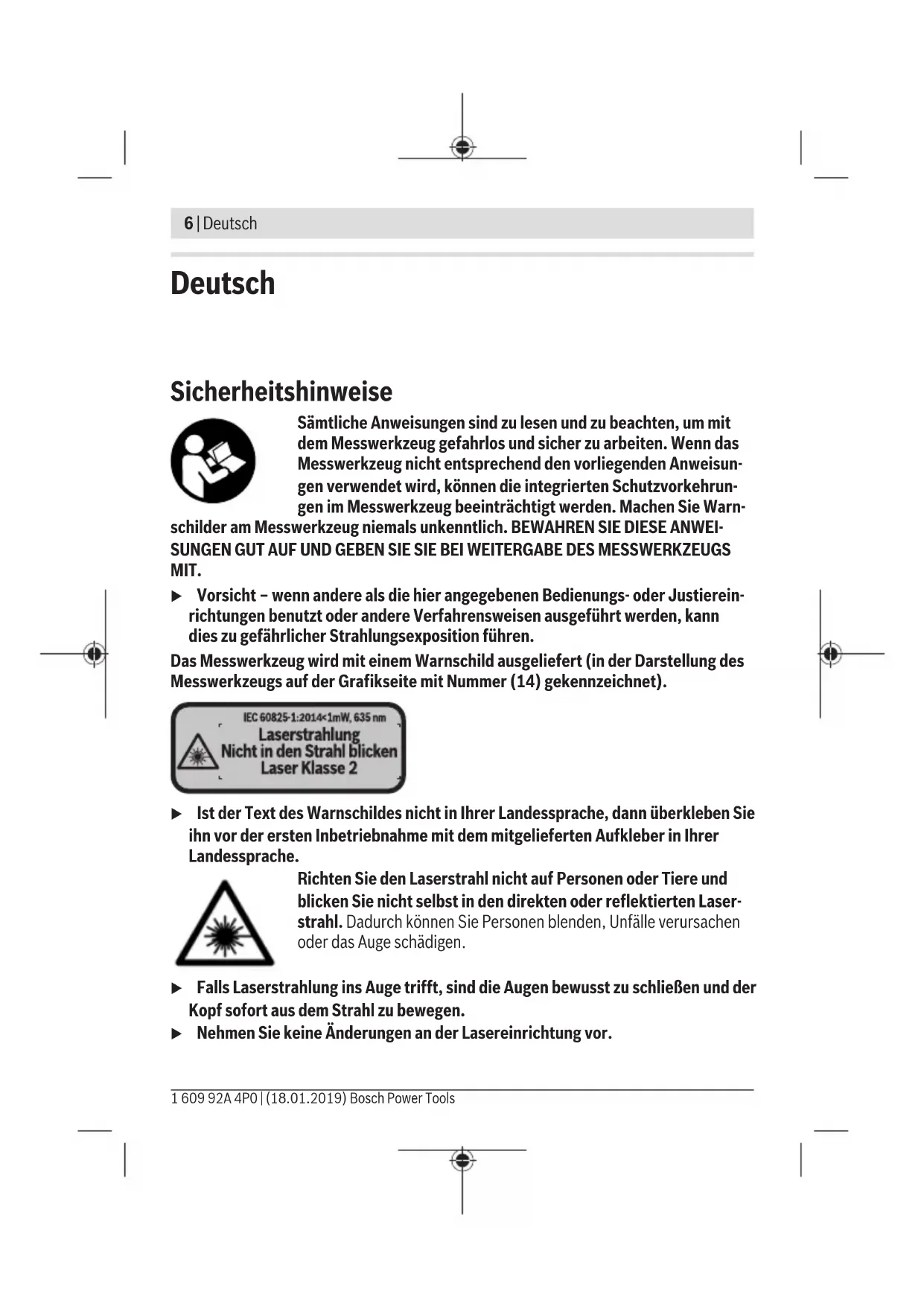 (15) (16) (17) Bosch Power Tools 1 609 92A 4P0 | (18.01.2019)6 | Deutsch Deutsch Sicherheitshinweise Sämtliche Anweisungen sind zu lesen und zu beachten, um mit dem Messwerkzeug gefahrlos und sicher zu arbeiten. Wenn das Messwerkzeug nicht entsprechend den vorliegenden Anweisun- gen verwendet wird, können die integrierten Schutzvorkehrun- gen im Messwerkzeug beeinträchtigt werden. Machen Sie Warn- schilder am Messwerkzeug niemals unkenntlich. BEWAHREN SIE DIESE ANWEI- SUNGEN GUT AUF UND GEBEN SIE SIE BEI WEITERGABE DES MESSWERKZEUGS MIT. u Vorsicht – wenn andere als die hier angegebenen Bedienungs- oder Justierein- richtungen benutzt oder andere Verfahrensweisen ausgeführt werden, kann dies zu gefährlicher Strahlungsexposition führen. Das Messwerkzeug wird mit einem Warnschild ausgeliefert (in der Darstellung des Messwerkzeugs auf der Grafikseite mit Nummer (14) gekennzeichnet). u Ist der Text des Warnschildes nicht in Ihrer Landessprache, dann überkleben Sie ihn vor der ersten Inbetriebnahme mit dem mitgelieferten Aufkleber in Ihrer Landessprache. Richten Sie den Laserstrahl nicht auf Personen oder Tiere und blicken Sie nicht selbst in den direkten oder reflektierten Laser- strahl. Dadurch können Sie Personen blenden, Unfälle verursachen oder das Auge schädigen. u Falls Laserstrahlung ins Auge trifft, sind die Augen bewusst zu schließen und der Kopf sofort aus dem Strahl zu bewegen. u Nehmen Sie keine Änderungen an der Lasereinrichtung vor. 1 609 92A 4P0 | (18.01.2019) Bosch Power ToolsDeutsch | 7 u Verwenden Sie die Laser-Sichtbrille nicht als Schutzbrille. Die Laser-Sichtbrille dient zum besseren Erkennen des Laserstrahls; sie schützt jedoch nicht vor der Laser- strahlung. u Verwenden Sie die Laser-Sichtbrille nicht als Sonnenbrille oder im Straßenver- kehr. Die Laser-Sichtbrille bietet keinen vollständigen UV-Schutz und vermindert die Farbwahrnehmung. u Lassen Sie das Messwerkzeug nur von qualifiziertem Fachpersonal und nur mit Original-Ersatzteilen reparieren. Damit wird sichergestellt, dass die Sicherheit des Messwerkzeuges erhalten bleibt. u Lassen Sie Kinder das Laser-Messwerkzeug nicht unbeaufsichtigt benutzen. Sie könnten unbeabsichtigt Personen blenden. u Arbeiten Sie mit dem Messwerkzeug nicht in explosionsgefährdeter Umgebung, in der sich brennbare Flüssigkeiten, Gase oder Stäube befinden. Im Messwerk- zeug können Funken erzeugt werden, die den Staub oder die Dämpfe entzünden. u Vorsicht! Bei der Verwendung des Messwerkzeugs mit Bluetooth ® kann eine Sto