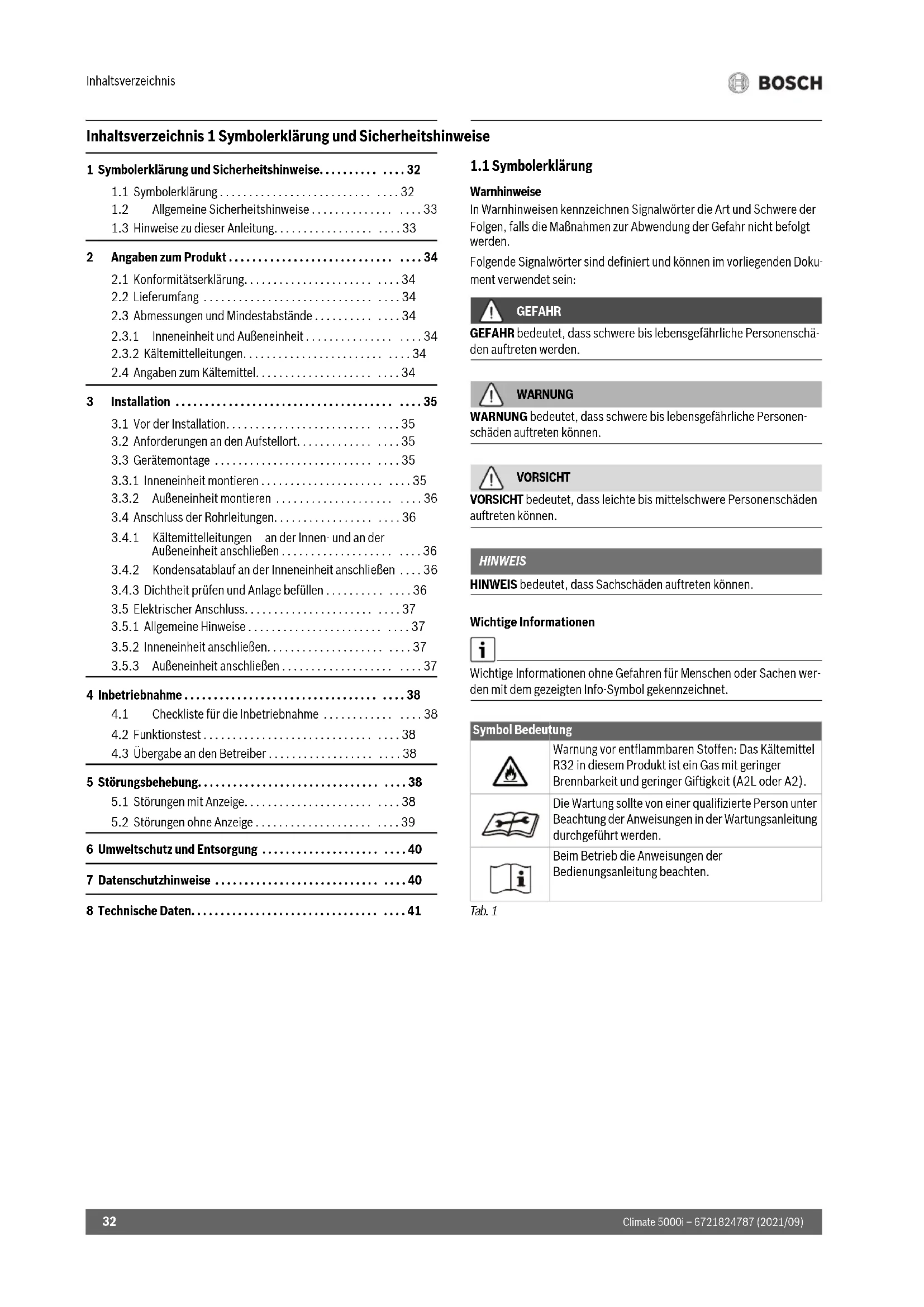 6 Umweltschutz und Entsorgung . . . . . . . . . . . . . . . . . . . . . . . . 40 7 Datenschutzhinweise . . . . . . . . . . . . . . . . . . . . . . . . . . . . . . . . 40 8 Technische Daten. . . . . . . . . . . . . . . . . . . . . . . . . . . . . . . . . . . . 41 Symbol Bedeutung Warnung vor entflammbaren Stoffen: Das Kältemittel R32 in diesem Produkt ist ein Gas mit geringer Brennbarkeit und geringer Giftigkeit (A2L oder A2). Die Wartung sollte von einer qualifizierte Person unter Beachtung der Anweisungen in der Wartungsanleitung durchgeführt werden. Beim Betrieb die Anweisungen der Bedienungsanleitung beachten.Symbolerklärung und Sicherheitshinweise