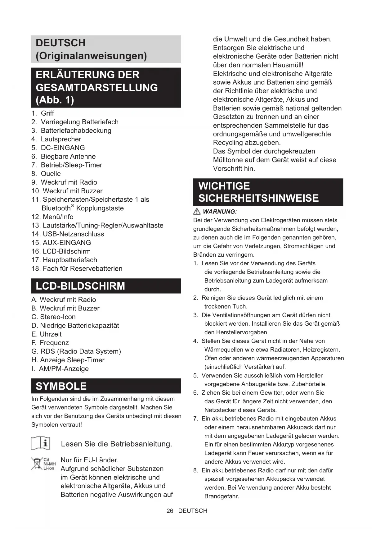 SYMBOLE Im Folgenden sind die im Zusammenhang mit diesem Gerät verwendeten Symbole dargestellt. Machen Sie sich vor der Benutzung des Geräts unbedingt mit diesen Symbolen vertraut! Lesen Sie die Betriebsanleitung. Nur für EU-Länder. Aufgrund schädlicher Substanzen im Gerät können elektrische und elektronische Altgeräte, Akkus und Batterien negative Auswirkungen auf die Umwelt und die Gesundheit haben. Entsorgen Sie elektrische und elektronische Geräte oder Batterien nicht über den normalen Hausmüll! Elektrische und elektronische Altgeräte sowie Akkus und Batterien sind gemäß der Richtlinie über elektrische und elektronische Altgeräte, Akkus und Batterien sowie gemäß national geltenden Gesetzten zu trennen und an einer entsprechenden Sammelstelle für das ordnungsgemäße und umweltgerechte Recycling abzugeben. Das Symbol der durchgekreuzten Mülltonne auf dem Gerät weist auf diese Vorschrift hin. WICHTIGE SICHERHEITSHINWEISE WARNUNG: Bei der Verwendung von Elektrogeräten müssen stets grundlegende Sicherheitsmaßnahmen befolgt werden, zu denen auch die im Folgenden genannten gehören, um die Gefahr von Verletzungen, Stromschlägen und Bränden zu verringern.