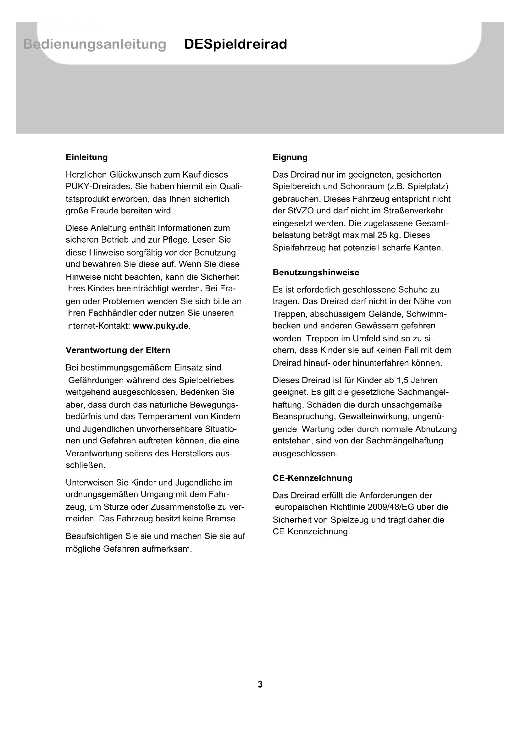 SCI Obsah Índice Содержание3 Bedienungsanleitung DESpieldreirad Einleitung Herzlichen Glückwunsch zum Kauf dieses PUKY-Dreirades. Sie haben hiermit ein Quali- tätsprodukt erworben, das Ihnen sicherlich große Freude bereiten wird. Diese Anleitung enthält Informationen zum sicheren Betrieb und zur Pflege. Lesen Sie diese Hinweise sorgfältig vor der Benutzung und bewahren Sie diese auf. Wenn Sie diese Hinweise nicht beachten, kann die Sicherheit Ihres Kindes beeinträchtigt werden. Bei Fra- gen oder Problemen wenden Sie sich bitte an Ihren Fachhändler oder nutzen Sie unseren Internet-Kontakt: www.puky.de. Verantwortung der Eltern Bei bestimmungsgemäßem Einsatz sind Gefährdungen während des Spielbetriebes weitgehend ausgeschlossen. Bedenken Sie aber, dass durch das natürliche Bewegungs- bedürfnis und das Temperament von Kindern und Jugendlichen unvorhersehbare Situatio- nen und Gefahren auftreten können, die eine Verantwortung seitens des Herstellers aus- schließen. Unterweisen Sie Kinder und Jugendliche im ordnungsgemäßen Umgang mit dem Fahr- zeug, um Stürze oder Zusammenstöße zu ver- meiden. Das Fahrzeug besitzt keine Bremse. Beaufsichtigen Sie sie und machen Sie sie auf mögliche Gefahren aufmerksam. Eignung Das Dreirad nur im geeigneten, gesicherten Spielbereich und Schonraum (z.B. Spielplatz) gebrauchen. Dieses Fahrzeug entspricht nicht der StVZO und darf nicht im Straßenverkehr eingesetzt werden. Die zugelassene Gesamt- belastung beträgt maximal 25 kg. Dieses Spielfahrzeug hat potenziell scharfe Kanten. Benutzungshinweise Es ist erforderlich geschlossene Schuhe zu tragen. Das Dreirad darf nicht in der Nähe von Treppen, abschüssigem Gelände, Schwimm- becken und anderen Gewässern gefahren werden. Treppen im Umfeld sind so zu si- chern, dass Kinder sie auf keinen Fall mit dem Dreirad hinauf- oder hinunterfahren können. Dieses Dreirad ist für Kinder ab 1,5 Jahren geeignet. Es gilt die gesetzliche Sachmängel- haftung. Schäden die durch unsachgemäße Beanspruchung, Gewalteinwirkung, ungenü- gende Wartung oder durch normale Abnutzung entstehen, sind von der Sachmängelhaftung ausgeschlossen. CE-Kennzeichnung Das Dreirad erfüllt die Anforderungen der europäischen Richtlinie 2009/48/EG über die Sicherheit von Spielzeug und trägt daher die CE-Kennzeichnung. Inhalt4 Spieldreirad Typenschild Das Typenschild ist unterhalb am hinteren Rahmen angebracht. Notieren Sie die Anga- ben auf dem Typenschild im Fahrzeugpass am Ende dieser Bedienungsanleitung, um sie bei Fragen oder Ersatzteilbestellungen zur Hand zu haben. Wartung und Pege Überprüfen Sie vor dem Gebrauch alle Teile auf möglichen Verschleiß, sowie die Ver- schraubungen auf ordnungsgemäßen Sitz. Selbst sichernde Muttern sind schwergängig und müssen nach vollständiger Demontage ersetzt werden! Damit das hohe, konstruktiv vorgegebene Sicherheitsniveau erhalten bleibt, sind ver- schlissene oder defekte Teile sofort gegen Original PUKY-Ersatzteile auszutauschen. Das Fahrzeug sollte bis zur Instandsetzung aus Sicherheitsgründen nicht benutzt werden. Verbogene Teile nicht richten, sondern austau- schen. Verschleißteile: Räder, Kurbellager. Das Dreirad darf nicht mit einem Hochdruck- reiniger gereinigt werden. Reinigen Sie das Dreirad mit einer leichten Seifenlösung und reiben Sie anschließend alles sorgfältig mit einem weichen Tuch trocken. Halten Sie korro- sionsfördernde Materialien (Streusalz, Meer- wasser, Dünger) von dem Dreirad fern. Das Dreirad darf nicht in feuchten Räumen gelagert werden. Auspacken und Lieferumfang Benutzen Sie zum Öffnen der Verpackung und zum Entfernen von Schutzmaterial keine scharfen Gegenstände. Sie könnten ver- sehentlich die Lackierung oder Teile des Drei- rades beschädigen. z Entnehmen Sie alle Teile aus der Ver- packung. z Entfernen Sie das Schutzmaterial. Halten Sie jegliches Verpackungsmaterial von Kindern fern, es besteht Erstickungsgefahr. z Prüfen Sie die Vollständigkeit und Unver- sehrtheit der Lieferung. Falls etwas fehlen sollte, dann wenden Sie sich bitte vor Be- ginn weiterer Arbeiten an Ihren Fachhändler. Die Lieferung besteht aus (Bild A):