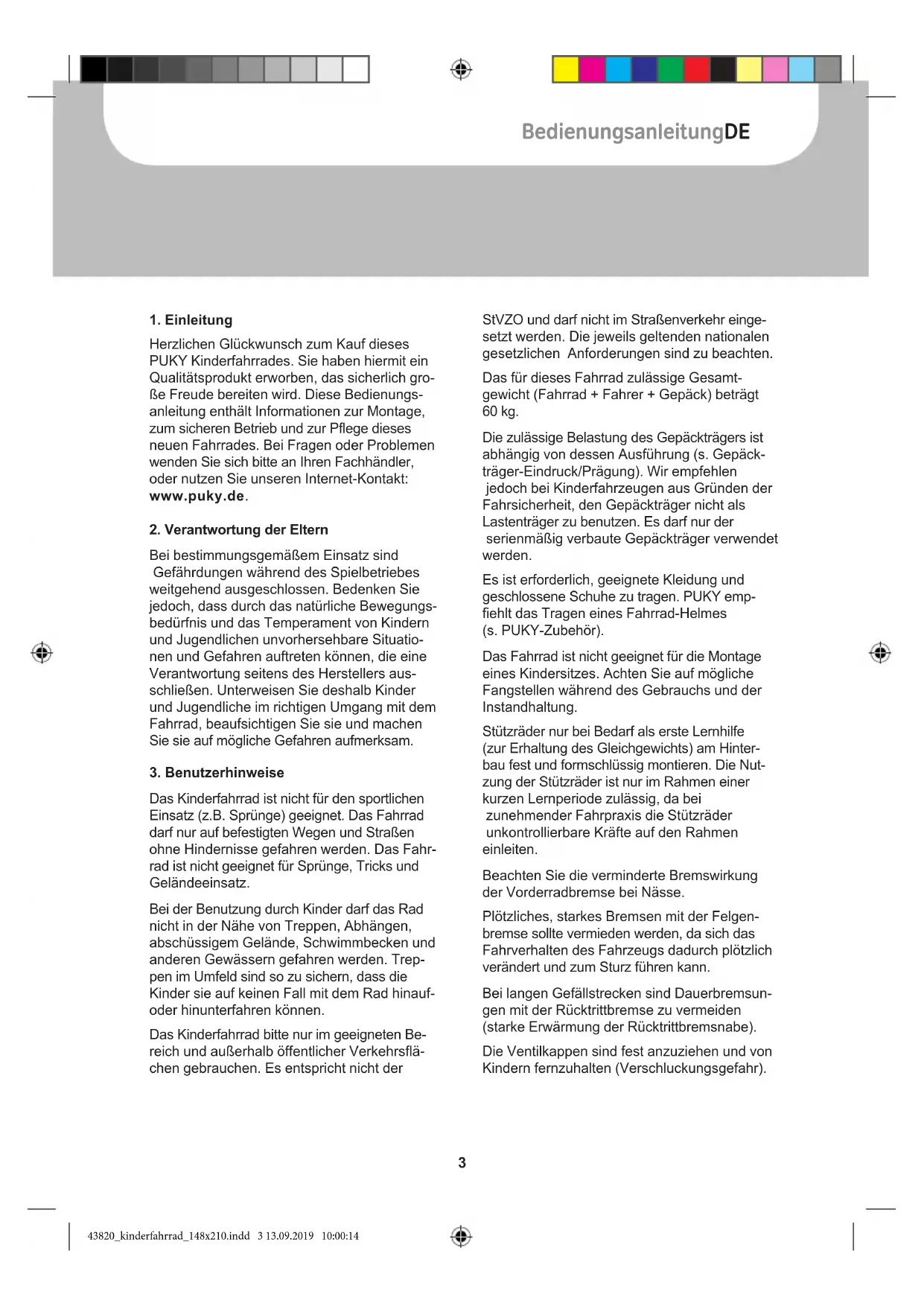 Das Kinderfahrrad ist nicht für den sportlichen Einsatz (z.B. Sprünge) geeignet. Das Fahrrad darf nur auf befestigten Wegen und Straßen ohne Hindernisse gefahren werden. Das Fahr- rad ist nicht geeignet für Sprünge, Tricks und Geländeeinsatz. Bei der Benutzung durch Kinder darf das Rad nicht in der Nähe von Treppen, Abhängen, abschüssigem Gelände, Schwimmbecken und anderen Gewässern gefahren werden. Trep- pen im Umfeld sind so zu sichern, dass die Kinder sie auf keinen Fall mit dem Rad hinauf- oder hinunterfahren können. Das Kinderfahrrad bitte nur im geeigneten Be- reich und außerhalb öffentlicher Verkehrsflä- chen gebrauchen. Es entspricht nicht der StVZO und darf nicht im Straßenverkehr einge- setzt werden. Die jeweils geltenden nationalen gesetzlichen Anforderungen sind zu beachten. Das für dieses Fahrrad zulässige Gesamt- gewicht (Fahrrad + Fahrer + Gepäck) beträgt 60 kg. Die zulässige Belastung des Gepäckträgers ist abhängig von dessen Ausführung (s. Gepäck- träger-Eindruck/Prägung). Wir empfehlen jedoch bei Kinderfahrzeugen aus Gründen der Fahrsicherheit, den Gepäckträger nicht als Lastenträger zu benutzen. Es darf nur der serienmäßig verbaute Gepäckträger verwendet werden. Es ist erforderlich, geeignete Kleidung und geschlossene Schuhe zu tragen. PUKY emp- fiehlt das Tragen eines Fahrrad-Helmes (s. PUKY-Zubehör). Das Fahrrad ist nicht geeignet für die Montage eines Kindersitzes. Achten Sie auf mögliche Fangstellen während des Gebrauchs und der Instandhaltung. Stützräder nur bei Bedarf als erste Lernhilfe (zur Erhaltung des Gleichgewichts) am Hinter- bau fest und formschlüssig montieren. Die Nut- zung der Stützräder ist nur im Rahmen einer kurzen Lernperiode zulässig, da bei zunehmender Fahrpraxis die Stützräder unkontrollierbare Kräfte auf den Rahmen einleiten. Beachten Sie die verminderte Bremswirkung der Vorderradbremse bei Nässe. Plötzliches, starkes Bremsen mit der Felgen- bremse sollte vermieden werden, da sich das Fahrverhalten des Fahrzeugs dadurch plötzlich verändert und zum Sturz führen kann. Bei langen Gefällstrecken sind Dauerbremsun- gen mit der Rücktrittbremse zu vermeiden (starke Erwärmung der Rücktrittbremsnabe). Die Ventilkappen sind fest anzuziehen und von Kindern fernzuhalten (Verschluckungsgefahr). 43820_kinderfahrrad_148x210.indd 3 13.09.2019 10:00:144 Bedienungsanleitung Kinderfahrrad Nachträgliche Anbauten und Veränderungen am Fahrrad (insbesondere an Bremseinrich- tungen) verändern die Fahreigenschaften und können zu einer Gefährdung führen.