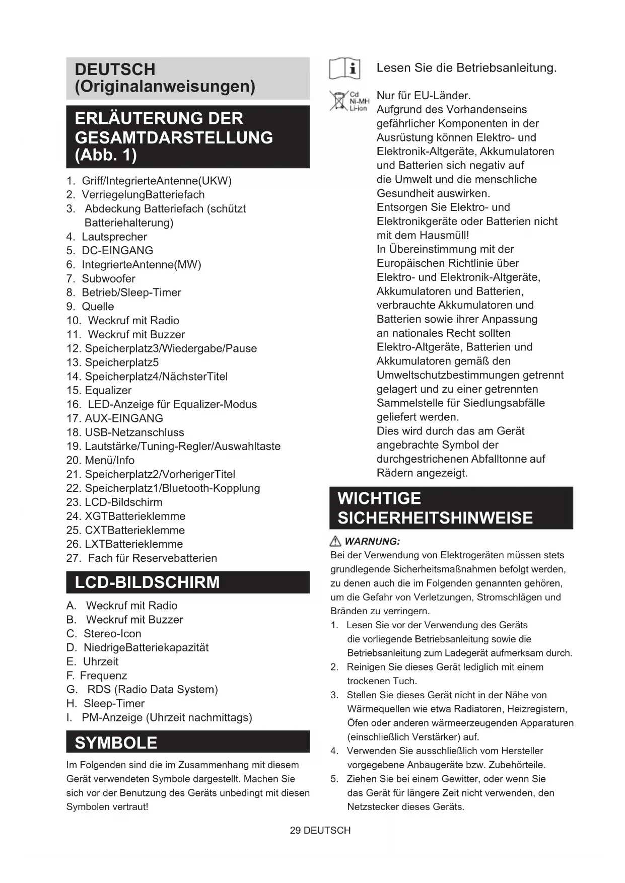 SYMBOLE Im Folgenden sind die im Zusammenhang mit diesem Gerät verwendeten Symbole dargestellt. Machen Sie sich vor der Benutzung des Geräts unbedingt mit diesen Symbolen vertraut! Lesen Sie die Betriebsanleitung. Nur für EU-Länder. Aufgrund des Vorhandenseins gefährlicher Komponenten in der Ausrüstung können Elektro- und Elektronik-Altgeräte, Akkumulatoren und Batterien sich negativ auf die Umwelt und die menschliche Gesundheit auswirken. Entsorgen Sie Elektro- und Elektronikgeräte oder Batterien nicht mit dem Hausmüll! In Übereinstimmung mit der Europäischen Richtlinie über Elektro- und Elektronik-Altgeräte, Akkumulatoren und Batterien, verbrauchte Akkumulatoren und Batterien sowie ihrer Anpassung an nationales Recht sollten Elektro-Altgeräte, Batterien und Akkumulatoren gemäß den Umweltschutzbestimmungen getrennt gelagert und zu einer getrennten Sammelstelle für Siedlungsabfälle geliefert werden. Dies wird durch das am Gerät angebrachte Symbol der durchgestrichenen Abfalltonne auf Rädern angezeigt. WICHTIGE SICHERHEITSHINWEISE WARNUNG: Bei der Verwendung von Elektrogeräten müssen stets grundlegende Sicherheitsmaßnahmen befolgt werden, zu denen auch die im Folgenden genannten gehören, um die Gefahr von Verletzungen, Stromschlägen und Bränden zu verringern.
