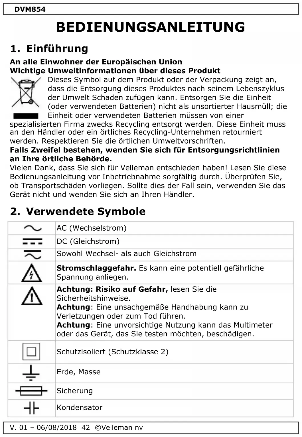 Funktioniert das Gerät beim Messen nicht mehr korrekt, dann ist die interne Sicherung defekt. Eine schwache Batterie kann zu ungenauen Messergebnissen führen. Ersetzen Sie Batterie regelmäßig. (Hinweis: Verringert sich die Intensität der Hintergrundbeleuchtung/des LCD-Displays, dann ist die Batterie schwach) Verwenden Sie dieses Gerät nur mit originellen Zubehörteilen. Velleman NV übernimmt keine Haftung für Schaden oder Verletzungen bei (falscher) Anwendung dieses Gerätes. Mehr Informationen zu diesem Produkt und die neueste Version dieser Bedienungsanleitung finden Sie hier: www.velleman.eu. Alle Änderungen ohne vorherige Ankündigung vorbehalten.DVM854