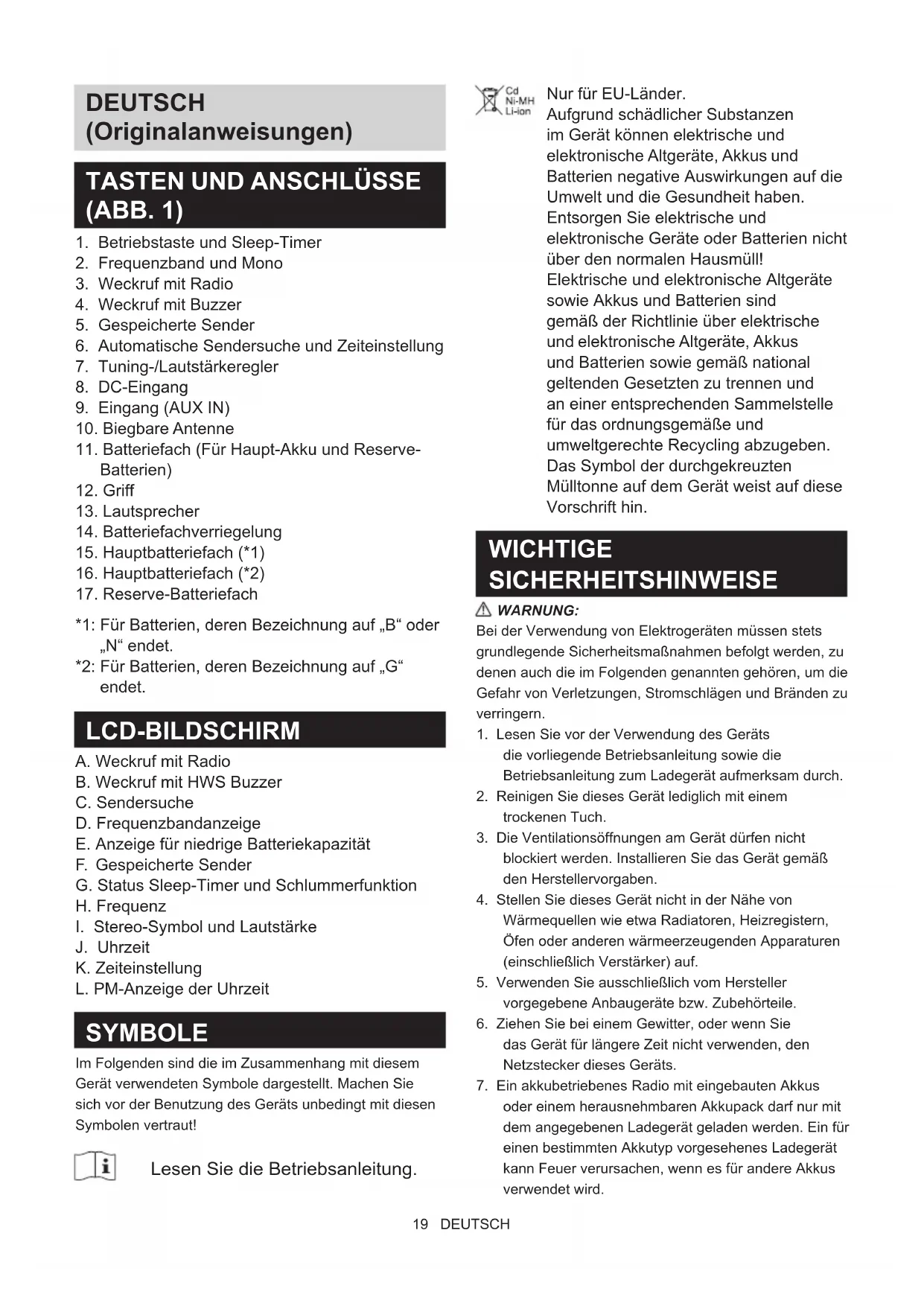 J. Uhrzeit K. Zeiteinstellung L. PM-Anzeige der Uhrzeit SYMBOLE Im Folgenden sind die im Zusammenhang mit diesem Gerät verwendeten Symbole dargestellt. Machen Sie sich vor der Benutzung des Geräts unbedingt mit diesen Symbolen vertraut! Lesen Sie die Betriebsanleitung. Nur für EU-Länder. Aufgrund schädlicher Substanzen im Gerät können elektrische und elektronische Altgeräte, Akkus und Batterien negative Auswirkungen auf die Umwelt und die Gesundheit haben. Entsorgen Sie elektrische und elektronische Geräte oder Batterien nicht über den normalen Hausmüll! Elektrische und elektronische Altgeräte sowie Akkus und Batterien sind gemäß der Richtlinie über elektrische und elektronische Altgeräte, Akkus und Batterien sowie gemäß national geltenden Gesetzten zu trennen und an einer entsprechenden Sammelstelle für das ordnungsgemäße und umweltgerechte Recycling abzugeben. Das Symbol der durchgekreuzten Mülltonne auf dem Gerät weist auf diese Vorschrift hin. WICHTIGE SICHERHEITSHINWEISE WARNUNG: Bei der Verwendung von Elektrogeräten müssen stets grundlegende Sicherheitsmaßnahmen befolgt werden, zu denen auch die im Folgenden genannten gehören, um die Gefahr von Verletzungen, Stromschlägen und Bränden zu verringern.