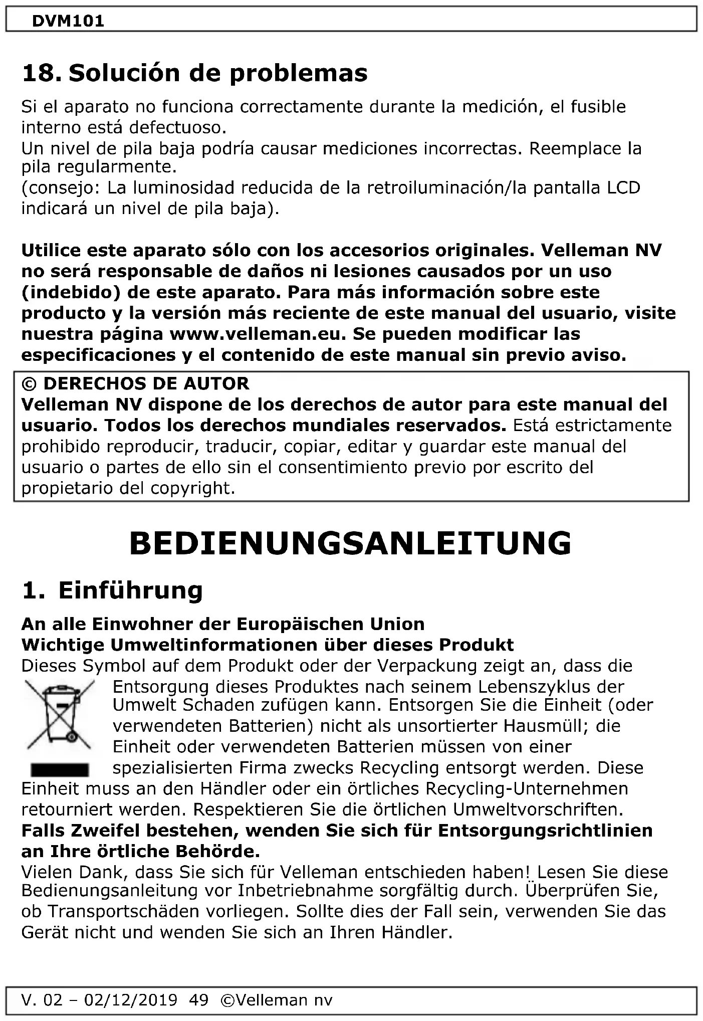 Funktioniert das Gerät beim Messen nicht mehr korrekt, dann ist die interne Sicherung defekt. Eine schwache Batterie kann zu ungenauen Messergebnissen führen. Ersetzen Sie Batterie regelmäßig. (Hinweis: Verringert sich die Intensität der Hintergrundbeleuchtung/des LCD-Displays, dann ist die Batterie schwach) Verwenden Sie dieses Gerät nur mit originellen Zubehörteilen. Velleman NV übernimmt keine Haftung für Schaden oder Verletzungen bei (falscher) Anwendung dieses Gerätes. Mehr Informationen zu diesem Produkt und die neueste Version dieser Bedienungsanleitung finden Sie hier: www.velleman.eu. Alle Änderungen ohne vorherige Ankündigung vorbehalten. © URHEBERRECHT Velleman NV besitzt das Urheberrecht für diese Bedienungsanleitung. Alle weltweiten Rechte vorbehalten. Ohne vorherige schriftliche Genehmigung des Urhebers ist es nicht gestattet, diese Bedienungsanleitung ganz oder in Teilen zu reproduzieren, zu kopieren, zu übersetzen, zu bearbeiten oder zu speichern.