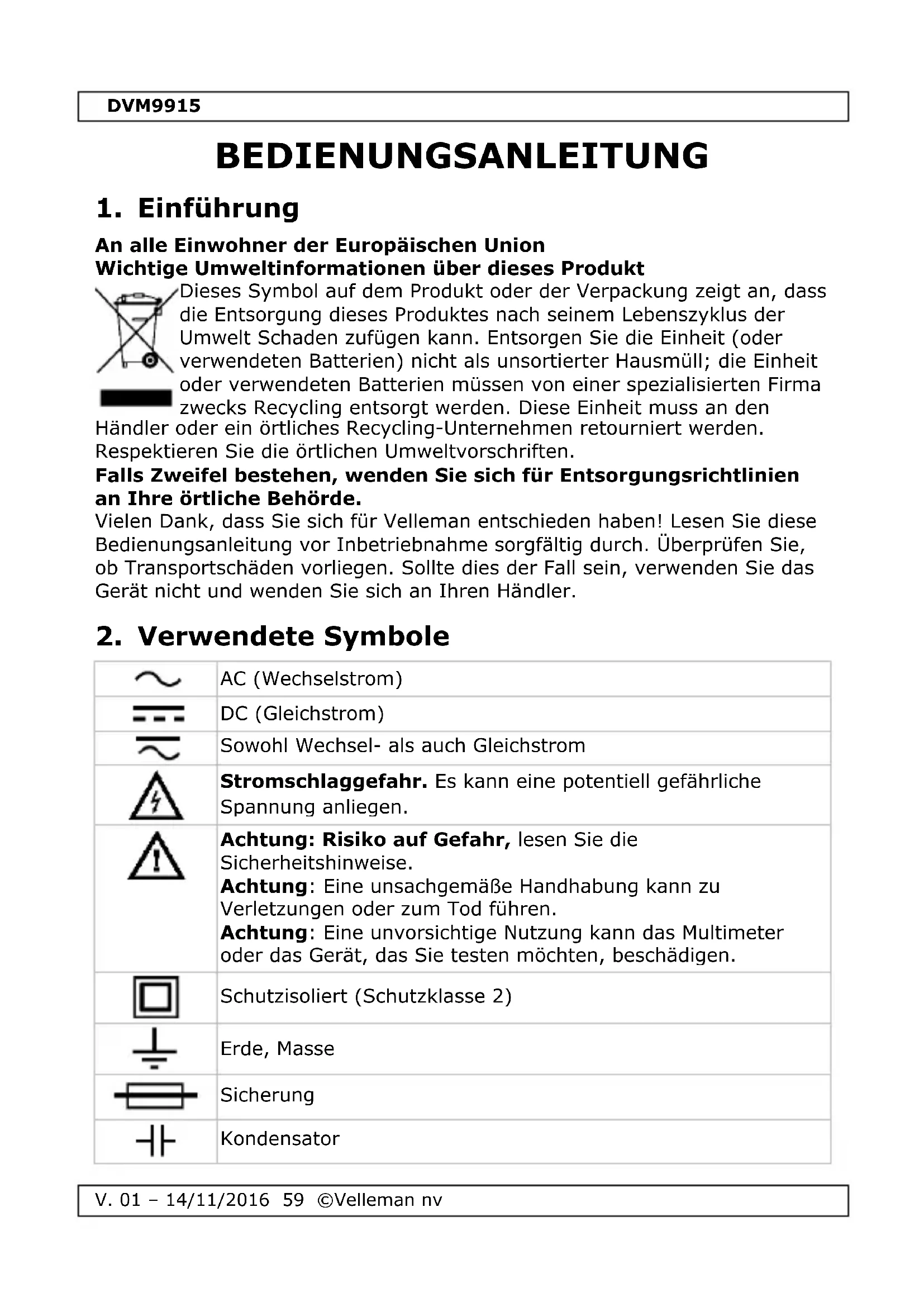 Bleibt ein akustisches Signal während der Durchgangsprüfung ertönen, dann ist die interne Sicherung (F0.5 A/600 V) defekt. Eine schwache Batterie kann zu ungenauen Messergebnissen führen. Ersetzen Sie Batterie regelmäßig. (Hinweis: Verringert sich die Intensität der Hintergrundbeleuchtung/des LCD-Displays, dann ist die Batterie schwach) Verwenden Sie dieses Gerät nur mit originellen Zubehörteilen. Velleman NV übernimmt keine Haftung für Schaden oder Verletzungen bei (falscher) Anwendung dieses Gerätes. Mehr Informationen zu diesem Produkt und die neueste Version dieser Bedienungsanleitung finden Sie hier: www.velleman.eu. Alle Änderungen ohne vorherige Ankündigung vorbehalten. © URHEBERRECHT Velleman NV besitzt das Urheberrecht für diese Bedienungsanleitung. Alle weltweiten Rechte vorbehalten. Ohne vorherige schriftliche Genehmigung des Urhebers ist es nicht gestattet, diese Bedienungsanleitung ganz oder in Teilen zu reproduzieren, zu kopieren, zu übersetzen, zu bearbeiten oder zu speichern.DVM9915