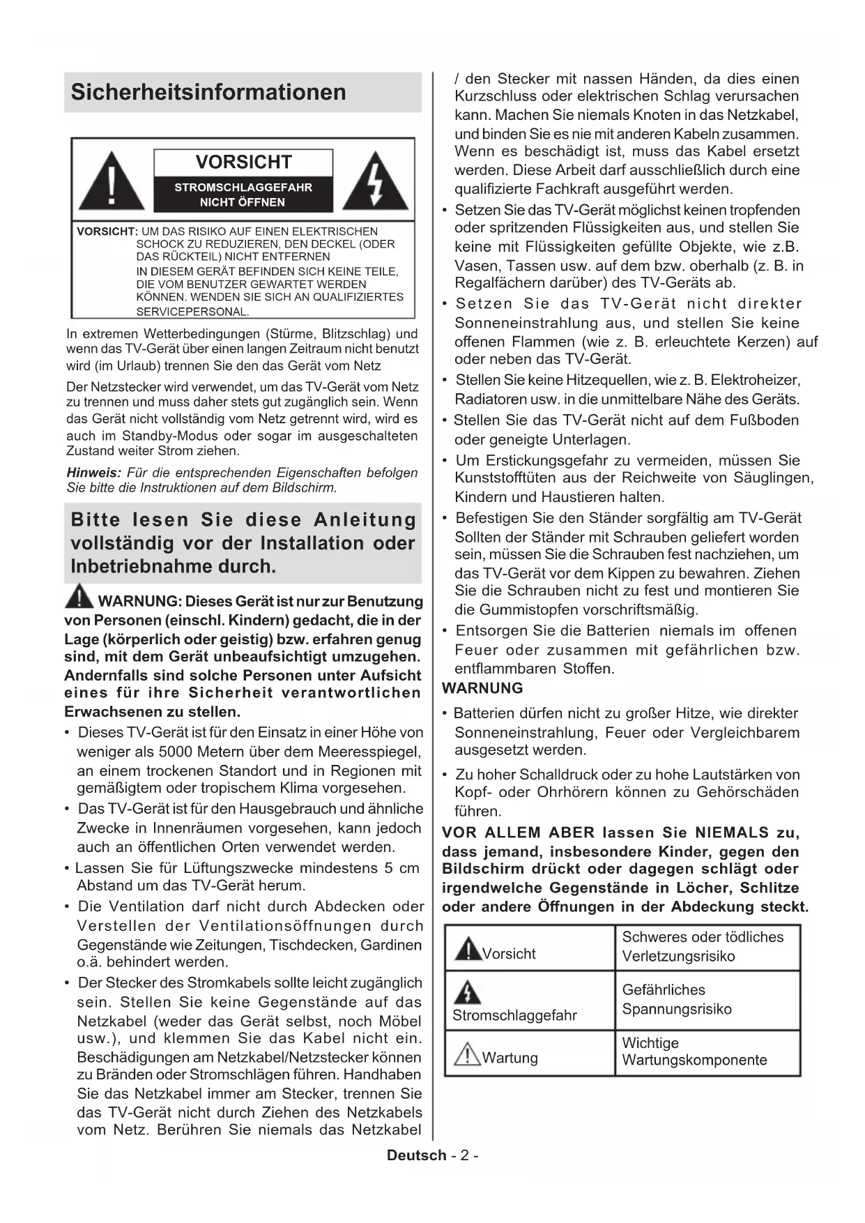 - Informationen zur Entsorgung Deutsch - 2 - Sicherheitsinformationen VORSICHT STROMSCHLAGGEFAHRNICHT ÖFFNENVORSICHT: UM DAS RISIKO AUF EINEN ELEKTRISCHEN SCHOCK ZU REDUZIEREN, DEN DECKEL (ODER DAS RÜCKTEIL) NICHT ENTFERNEN IN DIESEM GERÄT BEFINDEN SICH KEINE TEILE, DIE VOM BENUTZER GEWARTET WERDEN KÖNNEN. WENDEN SIE SICH AN QUALIFIZIERTES SERVICEPERSONAL.Hinweis: Für die entsprechenden Eigenschaften befolgen Sie bitte die Instruktionen auf dem Bildschirm.In extremen Wetterbedingungen (Stürme, Blitzschlag) und wenn das TV-Gerät über einen langen Zeitraum nicht benutzt wird (im Urlaub) trennen Sie den das Gerät vom NetzDer Netzstecker wird verwendet, um das TV-Gerät vom Netz zu trennen und muss daher stets gut zugänglich sein. Wenn das Gerät nicht vollständig vom Netz getrennt wird, wird es auch im Standby-Modus oder sogar im ausgeschalteten Zustand weiter Strom ziehen. Bitte lesen Sie diese Anleitung vollständig vor der Installation oder Inbetriebnahme durch. WARNUNG: Dieses Gerät ist nur zur Benutzung von Personen (einschl. Kindern) gedacht, die in der Lage (körperlich oder geistig) bzw. erfahren genug sind, mit dem Gerät unbeaufsichtigt umzugehen. Andernfalls sind solche Personen unter Aufsicht eines für ihre Sicherheit verantwortlichen Erwachsenen zu stellen. p. 37