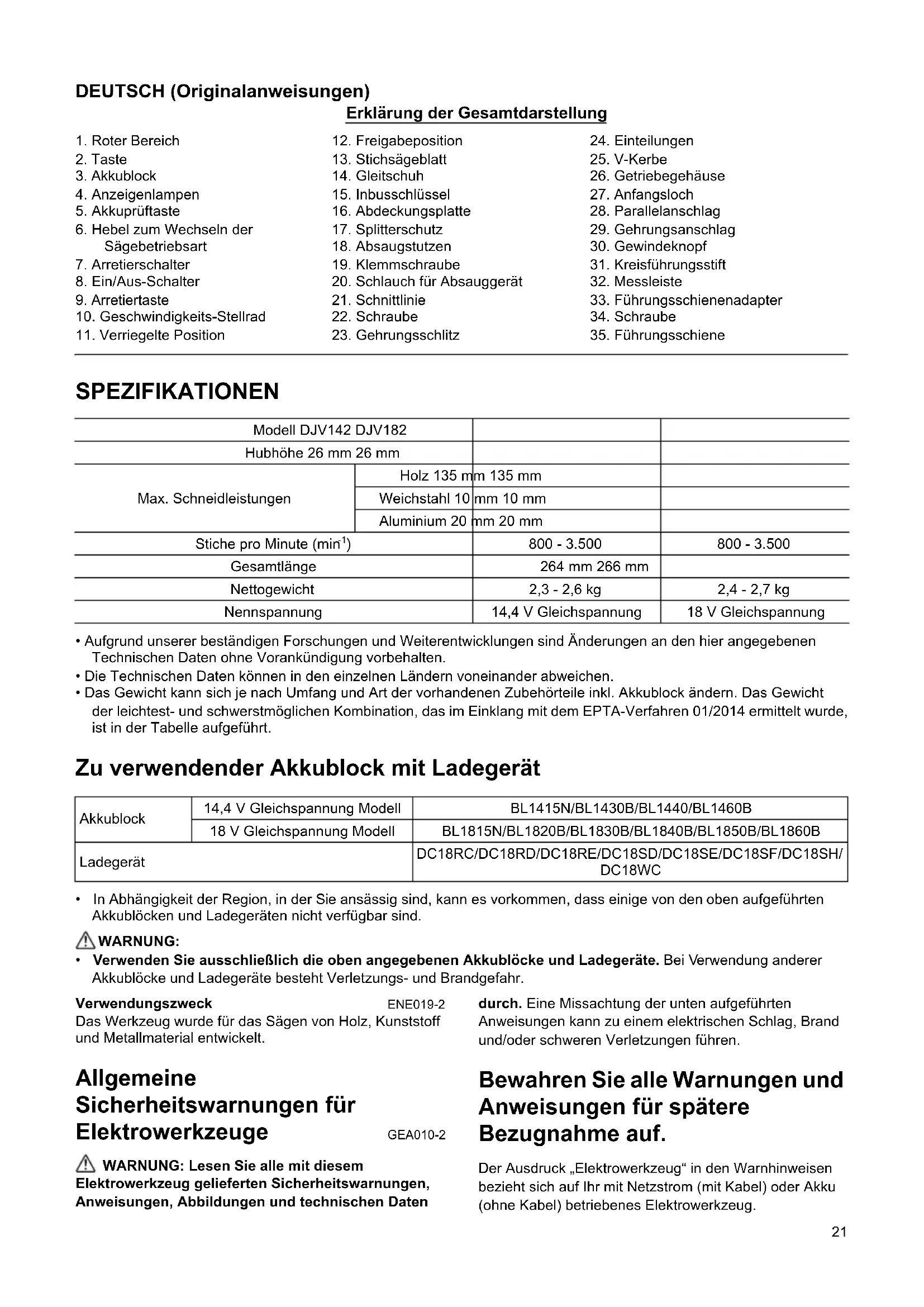 ) 800 - 3.500 800 - 3.500 Gesamtlänge 264 mm 266 mm Nettogewicht 2,3 - 2,6 kg 2,4 - 2,7 kg Nennspannung 14,4 V Gleichspannung 18 V Gleichspannung Akkublock 14,4 V Gleichspannung Modell BL1415N/BL1430B/BL1440/BL1460B 18 V Gleichspannung Modell BL1815N/BL1820B/BL1830B/BL1840B/BL1850B/BL1860B Ladegerät DC18RC/DC18RD/DC18RE/DC18SD/DC18SE/DC18SF/DC18SH/ DC18WC22 Sicherheitswarnungen für Akku- Stichsäge GEB187-2