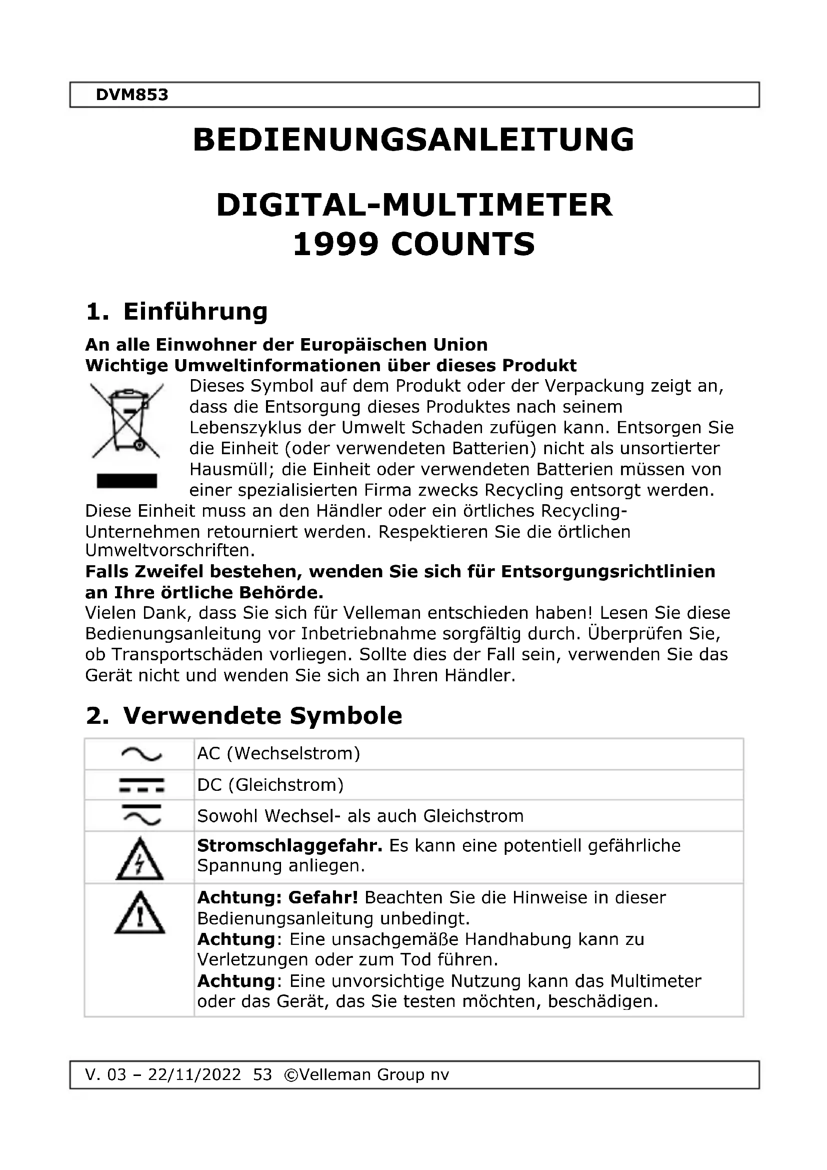 Achtung: Gefahr! Beachten Sie die Hinweise in dieser Bedienungsanleitung unbedingt. Achtung: Eine unsachgemäße Handhabung kann zu Verletzungen oder zum Tod führen. Achtung: Eine unvorsichtige Nutzung kann das Multimeter oder das Gerät, das Sie testen möchten, beschädigen.DVM853