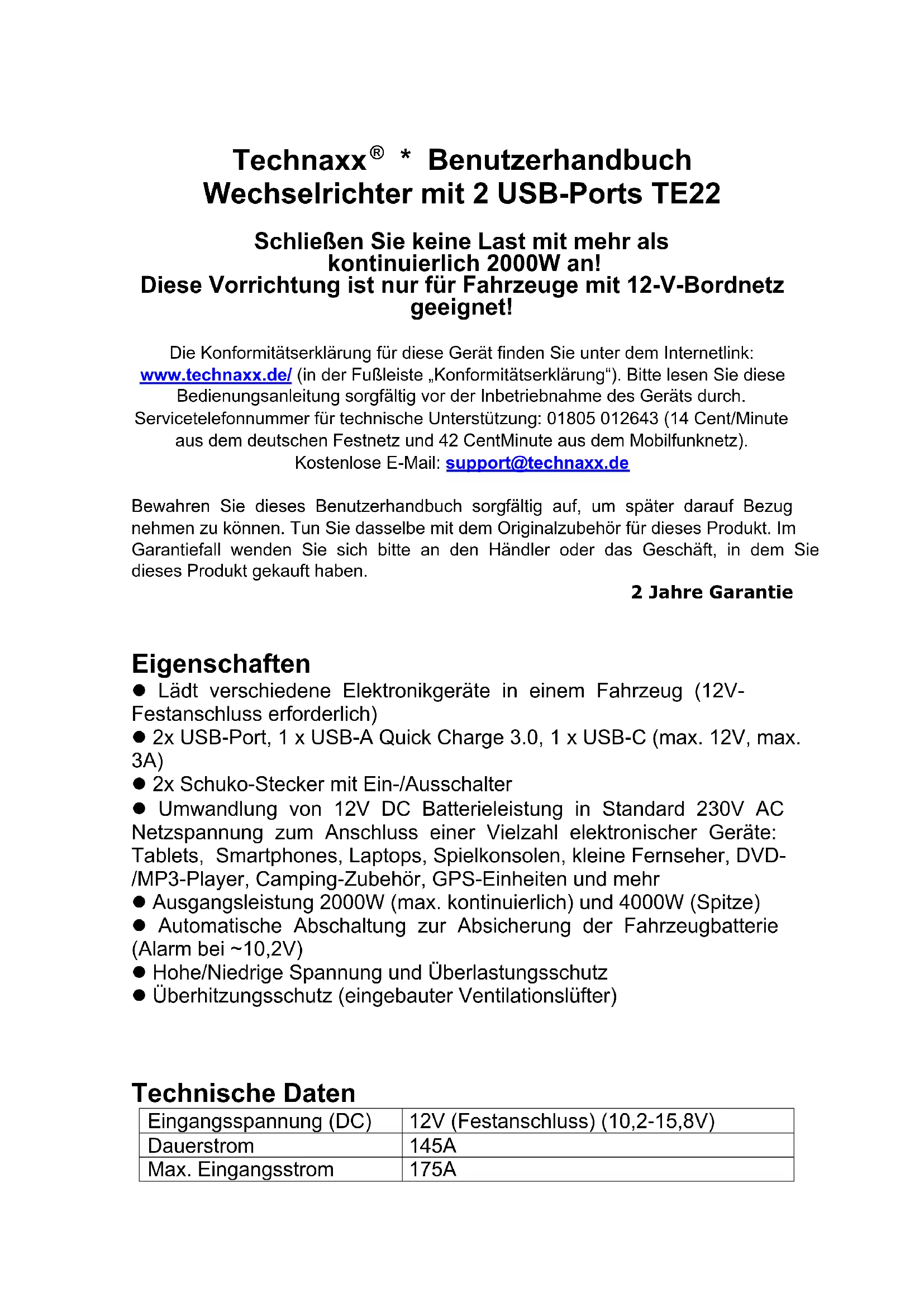 - Benutzerhandbuch Wechselrichter mit 2 USB-Ports TE22 Schließen Sie keine Last mit mehr als kontinuierlich 2000W an! Diese Vorrichtung ist nur für Fahrzeuge mit 12-V-Bordnetz geeignet! Die Konformitätserklärung für diese Gerät finden Sie unter dem Internetlink: www.technaxx.de/ (in der Fußleiste „Konformitätserklärung“). Bitte lesen Sie diese Bedienungsanleitung sorgfältig vor der Inbetriebnahme des Geräts durch. Servicetelefonnummer für technische Unterstützung: 01805 012643 (14 Cent/Minute aus dem deutschen Festnetz und 42 CentMinute aus dem Mobilfunknetz). Kostenlose E-Mail: support@technaxx.de Bewahren Sie dieses Benutzerhandbuch sorgfältig auf, um später darauf Bezug nehmen zu können. Tun Sie dasselbe mit dem Originalzubehör für dieses Produkt. Im Garantiefall wenden Sie sich bitte an den Händler oder das Geschäft, in dem Sie dieses Produkt gekauft haben. 2 Jahre Garantie