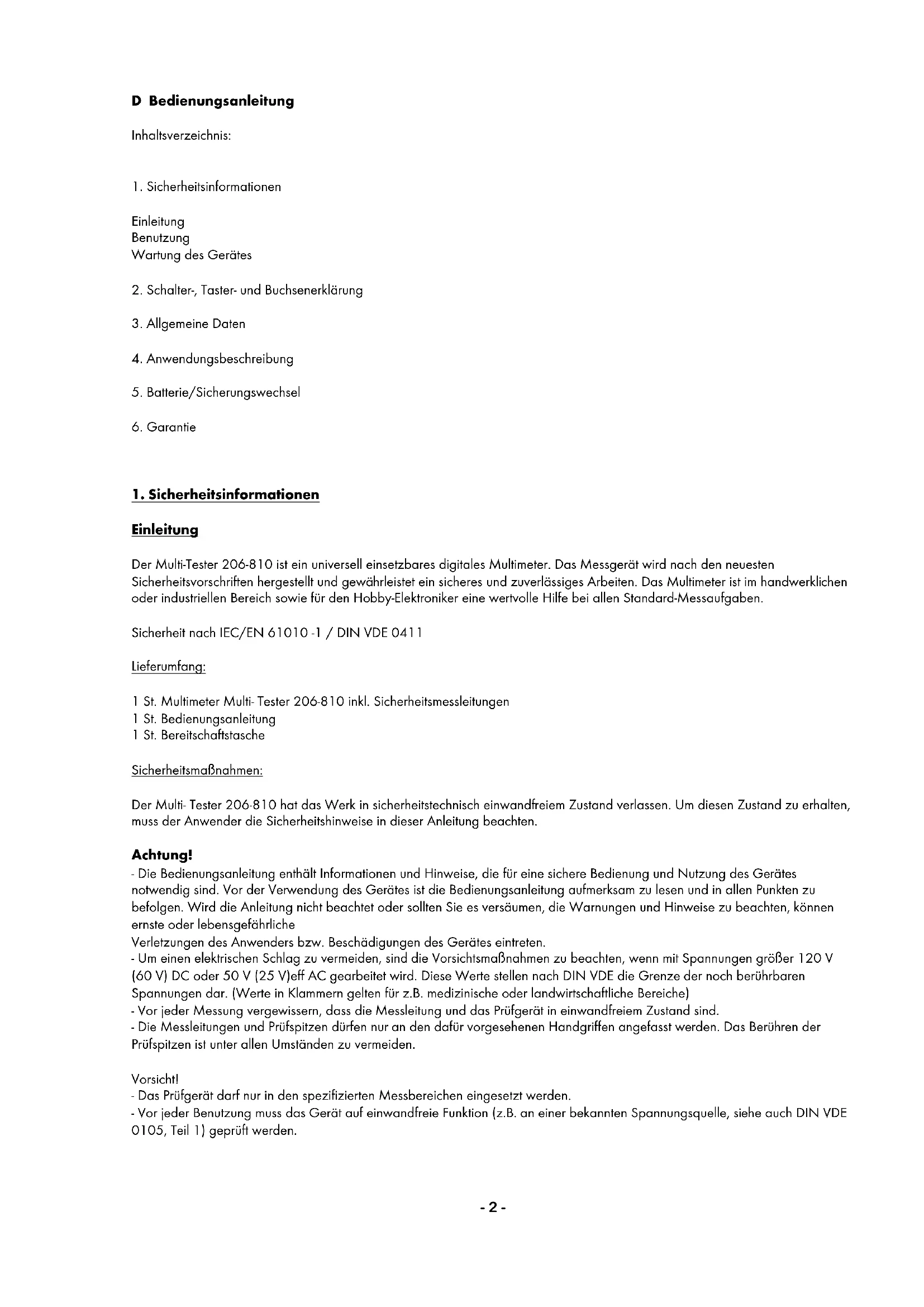 Der Multi- Tester 206-810 hat das Werk in sicherheitstechnisch einwandfreiem Zustand verlassen. Um diesen Zustand zu erhalten, muss der Anwender die Sicherheitshinweise in dieser Anleitung beachten. Achtung! - Die Bedienungsanleitung enthält Informationen und Hinweise, die für eine sichere Bedienung und Nutzung des Gerätes notwendig sind. Vor der Verwendung des Gerätes ist die Bedienungsanleitung aufmerksam zu lesen und in allen Punkten zu befolgen. Wird die Anleitung nicht beachtet oder sollten Sie es versäumen, die Warnungen und Hinweise zu beachten, können ernste oder lebensgefährliche Verletzungen des Anwenders bzw. Beschädigungen des Gerätes eintreten. - Um einen elektrischen Schlag zu vermeiden, sind die Vorsichtsmaßnahmen zu beachten, wenn mit Spannungen größer 120 V (60 V) DC oder 50 V (25 V)eff AC gearbeitet wird. Diese Werte stellen nach DIN VDE die Grenze der noch berührbaren Spannungen dar. (Werte in Klammern gelten für z.B. medizinische oder landwirtschaftliche Bereiche) - Vor jeder Messung vergewissern, dass die Messleitung und das Prüfgerät in einwandfreiem Zustand sind. - Die Messleitungen und Prüfspitzen dürfen nur an den dafür vorgesehenen Handgriffen angefasst werden. Das Berühren der Prüfspitzen ist unter allen Umständen zu vermeiden. Vorsicht! - Das Prüfgerät darf nur in den spezifizierten Messbereichen eingesetzt werden. - Vor jeder Benutzung muss das Gerät auf einwandfreie Funktion (z.B. an einer bekannten Spannungsquelle, siehe auch DIN VDE 0105, Teil 1) geprüft werden.- 3 - Achtung! Das Gerät darf nur unter den Bedingungen und für die Zwecke eingesetzt werden, für die es konstruiert wurde. Hierzu sind besonders die Sicherheitshinweise, die technischen Daten mit den Umgebungsbedingungen und die Verwendung in trockener Umgebung zu beachten. Wartung Das Gerät benötigt bei einem Betrieb gemäß der Bedienungsanleitung keine besondere Wartung. Reinigung Sollte das Gerät durch den täglichen Gebrauch schmutzig geworden sein, kann das Gerät mit einem feuchten Tuch und etwas mildem Haushaltsreiniger gereinigt werden. Niemals scharfe Reiniger oder Lösungsmittel zur Reinigung verwenden.