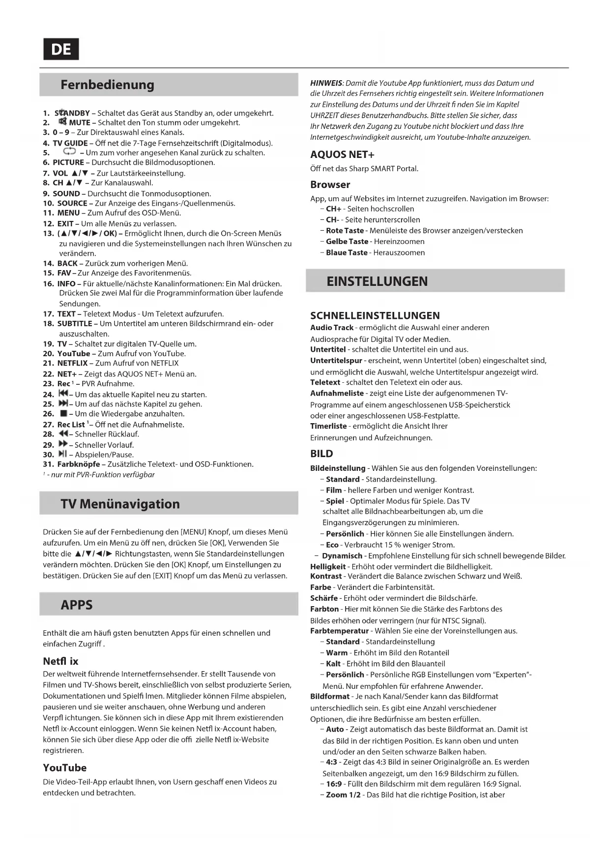 - nur mit PVR-Funktion verfügbar TV Menünavigation Drücken Sie auf der Fernbedienung den [MENU] Knopf, um dieses Menü aufzurufen. Um ein Menü zu ö nen, drücken Sie [OK], Verwenden Sie bitte die ▲/▼/◄/► Richtungstasten, wenn Sie Standardeinstellungen verändern möchten. Drücken Sie den [OK] Knopf, um Einstellungen zu bestätigen. Drücken Sie auf den [EXIT] Knopf um das Menü zu verlassen. APPS Enthält die am häu gsten benutzten Apps für einen schnellen und einfachen Zugri . Net ix Der weltweit führende Internetfernsehsender. Er stellt Tausende von Filmen und TV-Shows bereit, einschließlich von selbst produzierte Serien, Dokumentationen und Spiel lmen. Mitglieder können Filme abspielen, pausieren und sie weiter anschauen, ohne Werbung und anderen Verp ichtungen. Sie können sich in diese App mit Ihrem existierenden Net ix-Account einloggen. Wenn Sie keinen Net ix-Account haben, können Sie sich über diese App oder die o zielle Net ix-Website registrieren. YouTube Die Video-Teil-App erlaubt Ihnen, von Usern gescha enen Videos zu entdecken und betrachten. HINWEIS: Damit die Youtube App funktioniert, muss das Datum und die Uhrzeit des Fernsehers richtig eingestellt sein. Weitere Informationen zur Einstellung des Datums und der Uhrzeit nden Sie im Kapitel UHRZEIT dieses Benutzerhandbuchs. Bitte stellen Sie sicher, dass Ihr Netzwerk den Zugang zu Youtube nicht blockiert und dass Ihre Internetgeschwindigkeit ausreicht, um Youtube-Inhalte anzuzeigen. AQUOS NET+ Ö net das Sharp SMART Portal. Browser App, um auf Websites im Internet zuzugreifen. Navigation im Browser: CH+ - Seiten hochscrollen CH- - Seite herunterscrollen Rote Taste - Menüleiste des Browser anzeigen/verstecken Gelbe Taste - Hereinzoomen Blaue Taste - Herauszoomen EINSTELLUNGEN SCHNELLEINSTELLUNGEN Audio Track - ermöglicht die Auswahl einer anderen Audiosprache für Digital TV oder Medien. Untertitel - schaltet die Untertitel ein und aus. Untertitelspur - erscheint, wenn Untertitel (oben) eingeschaltet sind, und ermöglicht die Auswahl, welche Untertitelspur angezeigt wird. Teletext - schaltet den Teletext ein oder aus. Aufnahmeliste - zeigt eine Liste der aufgenommenen TV- Programme auf einem angeschlossenen USB-Speicherstick oder einer angeschlossenen USB-Festplatte. Timerliste - ermöglicht die Ansicht Ihrer Erinnerungen und Aufzeichnungen. BILD Bildeinstellung - Wählen Sie aus den folgenden Voreinstellungen: Standard - Standardeinstellung. Film - hellere Farben und weniger Kontrast. Spiel - Optimaler Modus für Spiele. Das TV schaltet alle Bildnachbearbeitungen ab, um die Eingangsverzögerungen zu minimieren. Persönlich - Hier können Sie alle Einstellungen ändern. Eco - Verbraucht 15 % weniger Strom. Dynamisch - Empfohlene Einstellung für sich schnell bewegende Bilder. Helligkeit - Erhöht oder vermindert die Bildhelligkeit. Kontrast - Verändert die Balance zwischen Schwarz und Weiß. Farbe - Verändert die Farbintensität. Schärfe - Erhöht oder vermindert die Bildschärfe. Farbton - Hier mit können Sie die Stärke des Farbtons des Bildes erhöhen oder verringern (nur für NTSC Signal). Farbtemperatur - Wählen Sie eine der Voreinstellungen aus. Standard - Standardeinstellung Warm - Erhöht im Bild den Rotanteil Kalt - Erhöht im Bild den Blauanteil Persönlich - Persönliche RGB Einstellungen vom “Experten”- Menü. Nur empfohlen für erfahrene Anwender. Bildformat - Je nach Kanal/Sender kann das Bildformat unterschiedlich sein. Es gibt eine Anzahl verschiedener Optionen, die ihre Bedürfnisse am besten erfüllen. Auto - Zeigt automatisch das beste Bildformat an. Damit ist das Bild in der richtigen Position. Es kann oben und unten und/oder an den Seiten schwarze Balken haben. 4:3 - Zeigt das 4:3 Bild in seiner Originalgröße an. Es werden Seitenbalken angezeigt, um den 16:9 Bildschirm zu füllen. 16:9 - Füllt den Bildschirm mit dem regulären 16:9 Signal. Zoom 1/2 - Das Bild hat die richtige Position, ist aber9 vergrößert, um den Bildschirm auszufüllen. Dot by Dot (HDMI) - Zeigt das Bild in seiner originalen, unveränderten, Au ösung an. Voll - Streckt das Signal, um den Bildschirm zu füllen. Experten Einstellungen Rauschunterdrückung - Filtert und verringert das Bildrauschen/Bildstörungen. Gamma - Zur Verstellung der Farbtöne zwischen den hellen und dunklen Bestandteilen des Bildes. Aktiver Kontrast - Optimiert automatisch die 'Hintergrundbeleuchtung" und den 'Bildkontrast' anhand der Bildschirmhelligkeit. Hintergrundbeleuchtung - Sie können die Helligkeit des Bildschirms durch die Erhöhung/Verminderung der Hintergrundbeleuchtung des Schirms anpassen. Rot - Zur Verstellung des Rottons des Bilds. Grün - Zur Verstellung des Grüntons des Bilds. Blau - Zur Verstellung des Blautons des Bilds. CMS Farbton - Hier können Sie die Farbtöne wämer (rötlicher) oder kälter (bläulicher) einstellen CMS Wert - ein höherer Wert macht bas Bild heller, ein niedriger Wert dunkler CMS Sättigung - Erhöht oder verringert die Sättigung einer gewählten Farbe SOUND Soundmodus - Wählen Sie eine der folgenden Voreinstellungen aus Standard - Standardeinstellungen Musik - Hebt Musik gegenüber Sprache hervor Film - Stellt live und vollen Sound für Filme zur Verfügung Sport - Hebt Sportgeräusche hervor Persönlich - Wählt Ihre eigenen Soundeinstellungen aus DTS Studio Sound - Hier können Sie den Surround Sound E ekt EIN oder AUS schalten. DTS DRC - stellt den Dynamikbereich für DTS-Film-Soundtracks ein. Sehr laute Geräusche werden leiser und ruhige Teile werden lauter. Empfohlen für Hören um die Mitternachtsstunde. Lautsprecher - zusätzliche Einstellungen für TV- Lautsprecher oder externe Lautsprecher. Digitaler Audioausgang - Einstellungen für den digitalen Audioausgang. Wählen Sie eine der folgenden Optionen: Auto - wählt automatisch die besten Einstellungen. PCM - Audiostream wird vom Fernseher verarbeitet. RAW - Audiostream wird von dem Gerät verarbeitet, das über einen dig