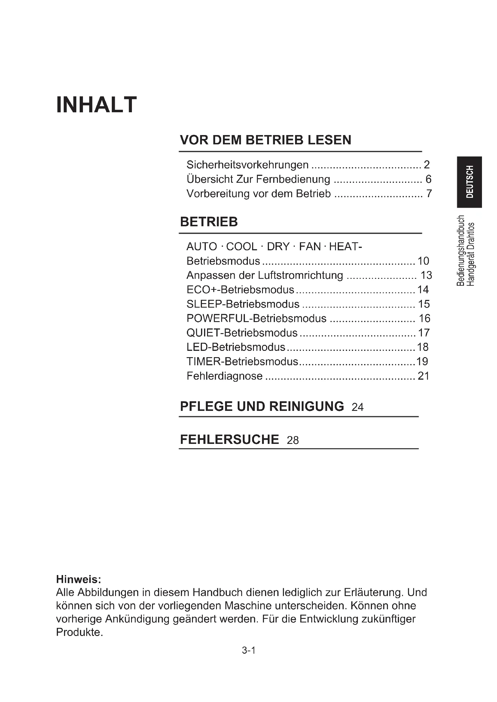 rivenditore. Se il guasto persiste, contattare il rivenditore / tecnico di assistenza di zona.Bedienungshandbuch Handgerät Drahtlos DEUTSCH 3-1 Hinweis: Alle Abbildungen in diesem Handbuch dienen lediglich zur Erläuterung. Und können sich von der vorliegenden Maschine unterscheiden. Können ohne vorherige Ankündigung geändert werden. Für die Entwicklung zukünftiger Produkte. INHALT