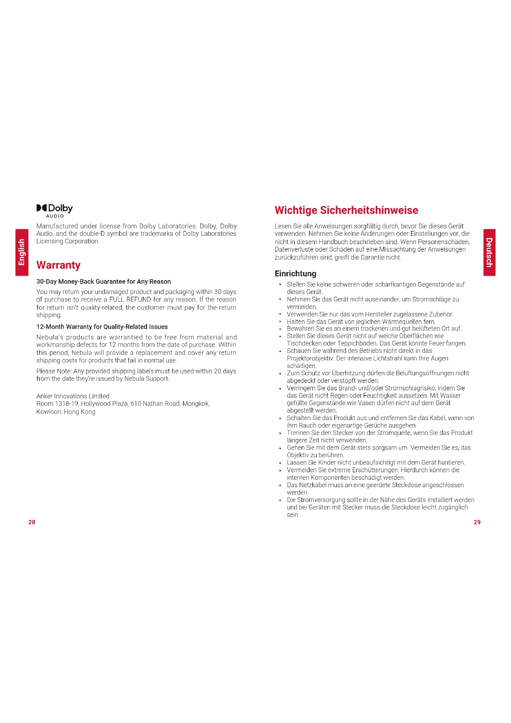 -Wortmarke und -Logos sind eingetragene Marken von Bluetooth SIG, Inc., und ihre Verwendung durch Anker Innovations Limited erfolgt unter Lizenz. Andere Marken und Markennamen sind Eigentum der jeweiligen Inhaber. Garantie Klare 30-Tage-Geld-zurück-Garantie Wenn Sie das unbeschädigte Produkt in der unbeschädigten Originalverpackung innerhalb von 30 Tagen ab Kaufdatum zurückgeben, wird Ihnen der GESAMTE KAUFPREIS ERSTATTET. Wenn der Grund für die Rücksendung allerdings kein Qualitätsmangel ist, trägt der Kunde die Versandkosten für die Rücksendung. 12 Monate Garantie bei qualitätsbezogenen Problemen Nebula Produkte sind für einen Zeitraum von 12 Monaten ab dem Kaufdatum gegen Material- und Verarbeitungsfehler garantiert. Innerhalb dieses Zeitraums stellt Nebula Ersatz bereit und trägt die Versandkosten für die Rücksendung, wenn ein Produkt bei normaler Verwendung ausfallen sollte. Please Note: Any provided shipping labels must be used within 20 days from the date they’re issued by Nebula Support. Anker Innovations Limited Room 1318-19, Hollywood Plaza, 610 Nathan Road, Mongkok, Kowloon, Hong Kong Instrucciones de seguridad importantes Lea todas las instrucciones antes de utilizar el dispositivo. No realice cambios ni cree ajustes que no estén descritos en este manual. En caso de que se produzcan lesiones, pérdida de datos o daños por no seguir las instrucciones, no se aplicará la garantía. Configuración