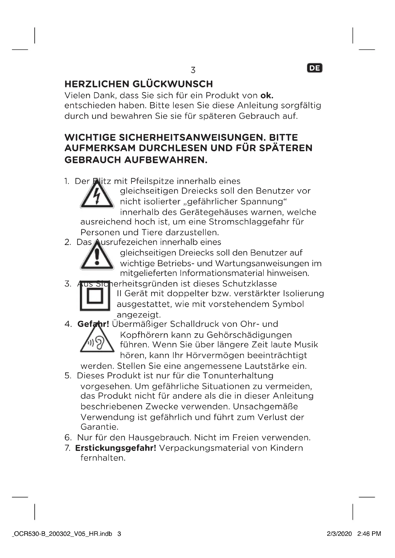Vielen Dank, dass Sie sich für ein Produkt von ok. entschieden haben. Bitte lesen Sie diese Anleitung sorgfältig durch und bewahren Sie sie für späteren Gebrauch auf.