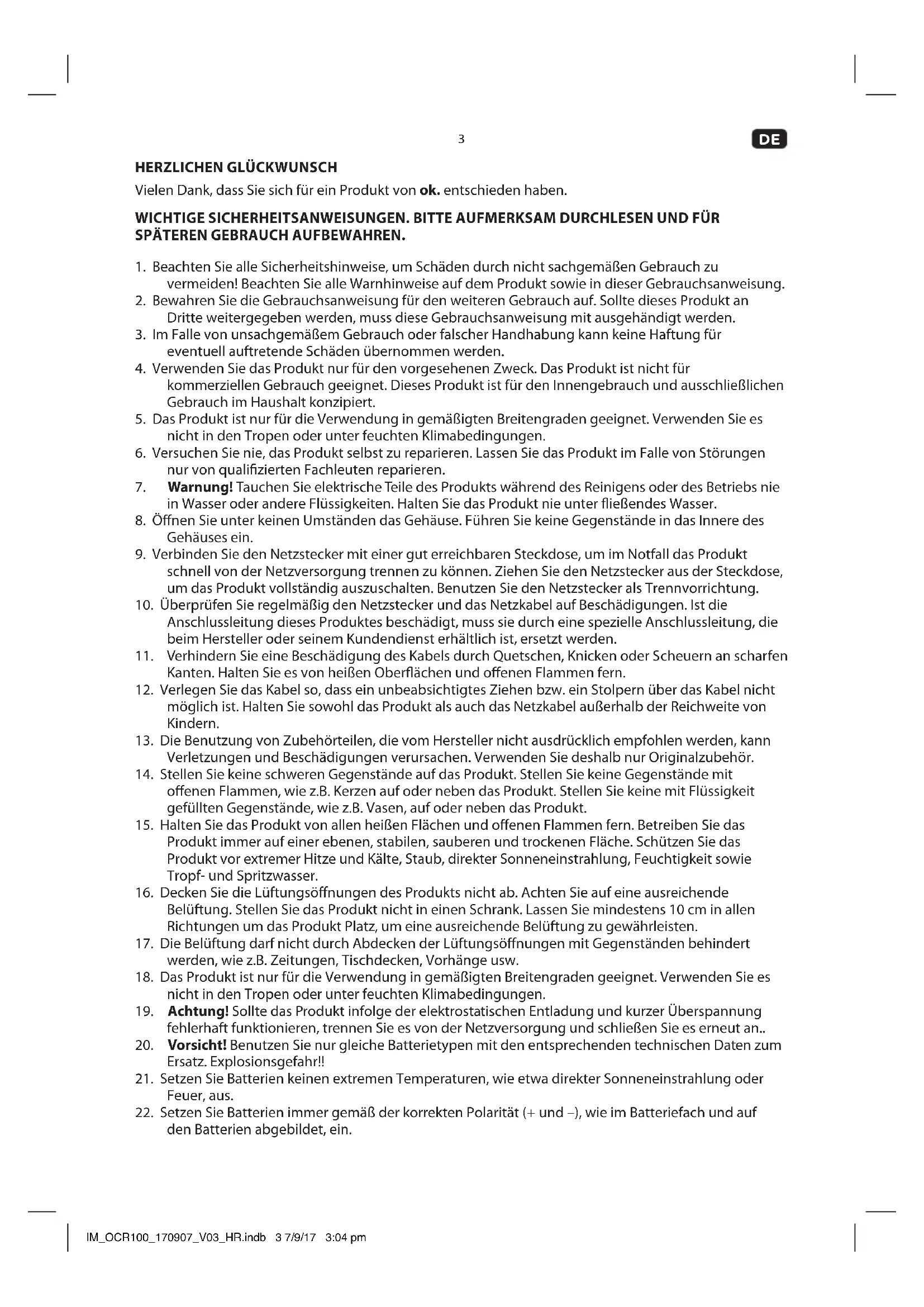 Vielen Dank, dass Sie sich für ein Produkt von ok. entschieden haben. WICHTIGE SICHERHEITSANWEISUNGEN. BITTE AUFMERKSAM DURCHLESEN UND FÜR SPÄTEREN GEBRAUCH AUFBEWAHREN.