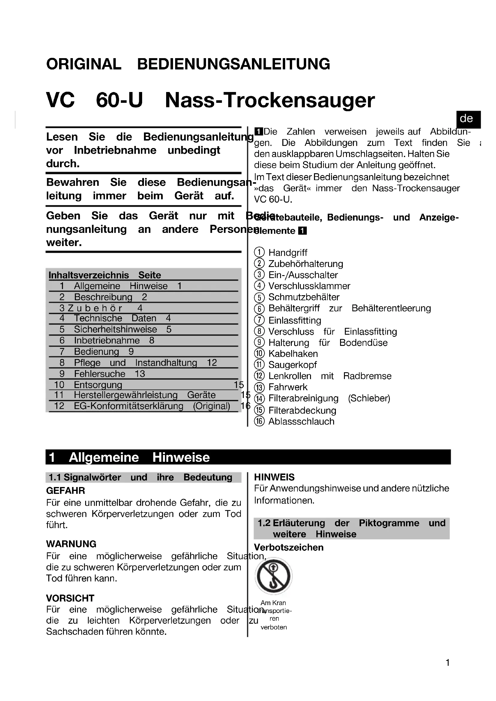 Printed: 05.12.2013 | Doc-Nr: PUB / 5071295 / 000 / 02ORIGINAL BEDIENUNGSANLEITUNG VC 60‑U Nass‑Trockensauger Lesen Sie die Bedienungsanleitungvor Inbetriebnahme unbedingtdurch.Bewahren Sie diese Bedienungsan-leitung immer beim Gerät auf.Geben Sie das Gerät nur mit Bedie-nungsanleitung an andere Personenweiter.Inhaltsverzeichnis Seite1 Allgemeine Hinweise 12 Beschreibung 23Zubehör 44 Technische Daten 45 Sicherheitshinweise 56 Inbetriebnahme 87 Bedienung 98 Pflege und Instandhaltung 129 Fehlersuche 1310 Entsorgung 1511 Herstellergewährleistung Geräte 1512 EG-Konformitätserklärung (Original) 161 Die Zahlen verweisen jeweils auf Abbildun-gen. Die Abbildungen zum Text finden Sie auf denausklappbarenUmschlagseiten.HaltenSie diese beim Studium der Anleitung geöffnet. ImText dieser Bedienungsanleitung bezeichnet »das Gerät« immer den Nass‑TrockensaugerVC 60‑U.Gerätebauteile, Bedienungs- und Anzeige-elemente 1 Handgriff Zubehörhalterung Ein‑/Ausschalter Verschlussklammer Schmutzbehälter Behältergriff zur Behälterentleerung Einlassfitting Verschluss für Einlassfitting Halterung für Bodendüse Kabelhaken Saugerkopf Lenkrollen mit Radbremse Fahrwerk Filterabreinigung (Schieber) Filterabdeckung Ablassschlauch 1 Allgemeine Hinweise