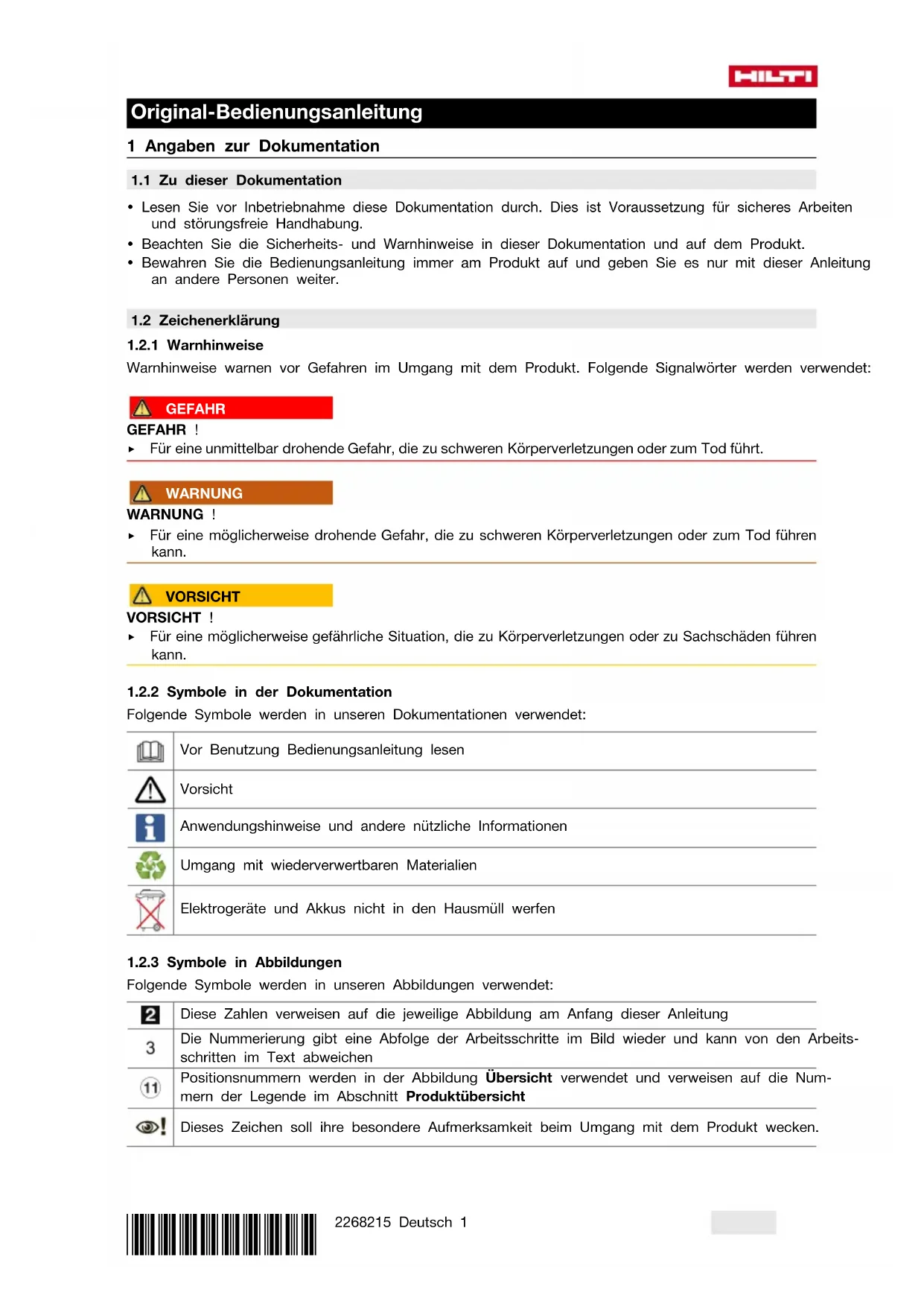 Folgende Symbole werden in unseren Abbildungen verwendet: Diese Zahlen verweisen auf die jeweilige Abbildung am Anfang dieser Anleitung Die Nummerierung gibt eine Abfolge der Arbeitsschritte im Bild wieder und kann von den Arbeits- schritten im Text abweichen Positionsnummern werden in der Abbildung Übersicht verwendet und verweisen auf die Num- mern der Legende im Abschnitt Produktübersicht Dieses Zeichen soll ihre besondere Aufmerksamkeit beim Umgang mit dem Produkt wecken.2 Deutsch 2268215 *2268215*