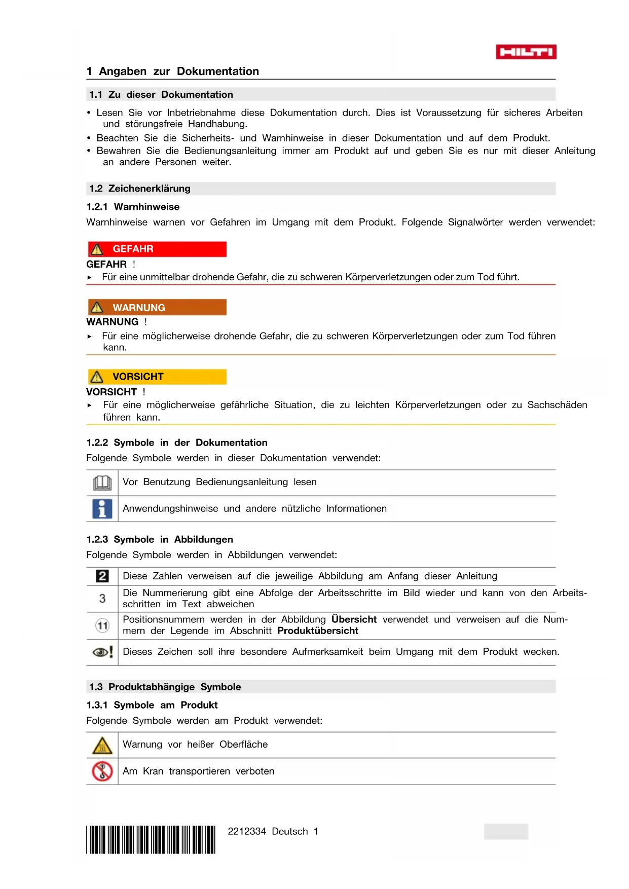 Wir erklären in alleiniger Verantwortung, dass das hier beschriebene Produkt mit den geltenden Richtlinien und Normen übereinstimmt. Ein Abbild der Konformitätserklärung finden Sie am Ende dieser Dokumentation. Die Technischen Dokumentationen sind hier hinterlegt: Hilti Entwicklungsgesellschaft mbH | Zulassung Geräte | Hiltistraße 6 | 86916 Kaufering, DE 2 Sicherheit