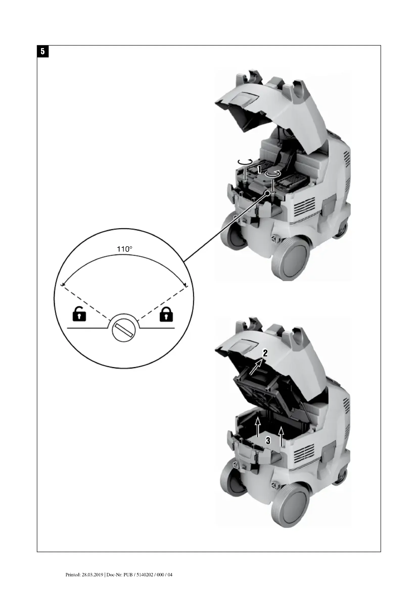 Printed: 24.03.2014 | Doc-Nr: PUB / 5140202 / 000 / 03 Printed: 28.03.2019 | Doc-Nr: PUB / 5140202 / 000 / 04Warnzeichen Warnung vor allgemeiner Gefahr Warnung vor ätzenden Stoffen Warnung vor gefährlicher elektrischer Spannung Warnung vor explosions- gefährlichen Stoffen Gebotszeichen Schutzklei- dung benutzen Schutzhand- schuhe benutzen Gehörschutz benutzen Schutz- schuhe benutzen Atemschutz benutzen Symbole Vor Benutzung Bedienungs- anleitung lesen Abfälle der Wiederver- wertung zuführen Am Gerät WARNUNG: Dieses Gerät enthält gesundheitsgefährliche Stäube. Entleerung und Wartung, einschliesslich der Ent- fernung des Staubbeutels, dürfen nur von sachkundigen Personen vorgenommen werden, die geeignete persön- liche Schutzausrüstung tragen. Nicht einschalten, bevor das komplette Filtersystem installiert ist und die Funktion der Volumenstromkontrolle überprüft wurde. Ort der Identifizierungsdetails auf dem Gerät Die Typenbezeichnung und die Serienkennzeichnung sind auf dem Typenschild Ihres Geräts angebracht. Übertragen Sie diese Angaben in Ihre Bedienungsan- leitung und beziehen Sie sich bei Anfragen an unsere Vertretung oder Servicestelle immer auf diese Angaben. Typ: Generation: 01 Serien Nr.: 2Beschreibung