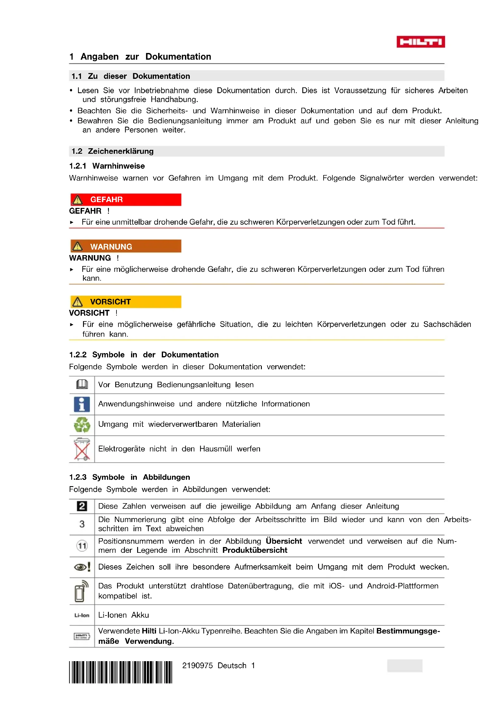 Folgende Symbole werden in Abbildungen verwendet: Diese Zahlen verweisen auf die jeweilige Abbildung am Anfang dieser Anleitung Die Nummerierung gibt eine Abfolge der Arbeitsschritte im Bild wieder und kann von den Arbeits- schritten im Text abweichen Positionsnummern werden in der Abbildung Übersicht verwendet und verweisen auf die Num- mern der Legende im Abschnitt Produktübersicht Dieses Zeichen soll ihre besondere Aufmerksamkeit beim Umgang mit dem Produkt wecken. Das Produkt unterstützt drahtlose Datenübertragung, die mit iOS- und Android-Plattformen kompatibel ist. Li-Ionen Akku Verwendete Hilti Li-Ion-Akku Typenreihe. Beachten Sie die Angaben im Kapitel Bestimmungsge- mäße Verwendung.2 Deutsch 2190975 *2190975* Benutzen Sie den Akku niemals als Schlagwerkzeug. Lassen Sie den Akku nicht fallen. Verwenden Sie keinen Akku, der einen Schlag erhalten hat oder anderweitig beschädigt ist.