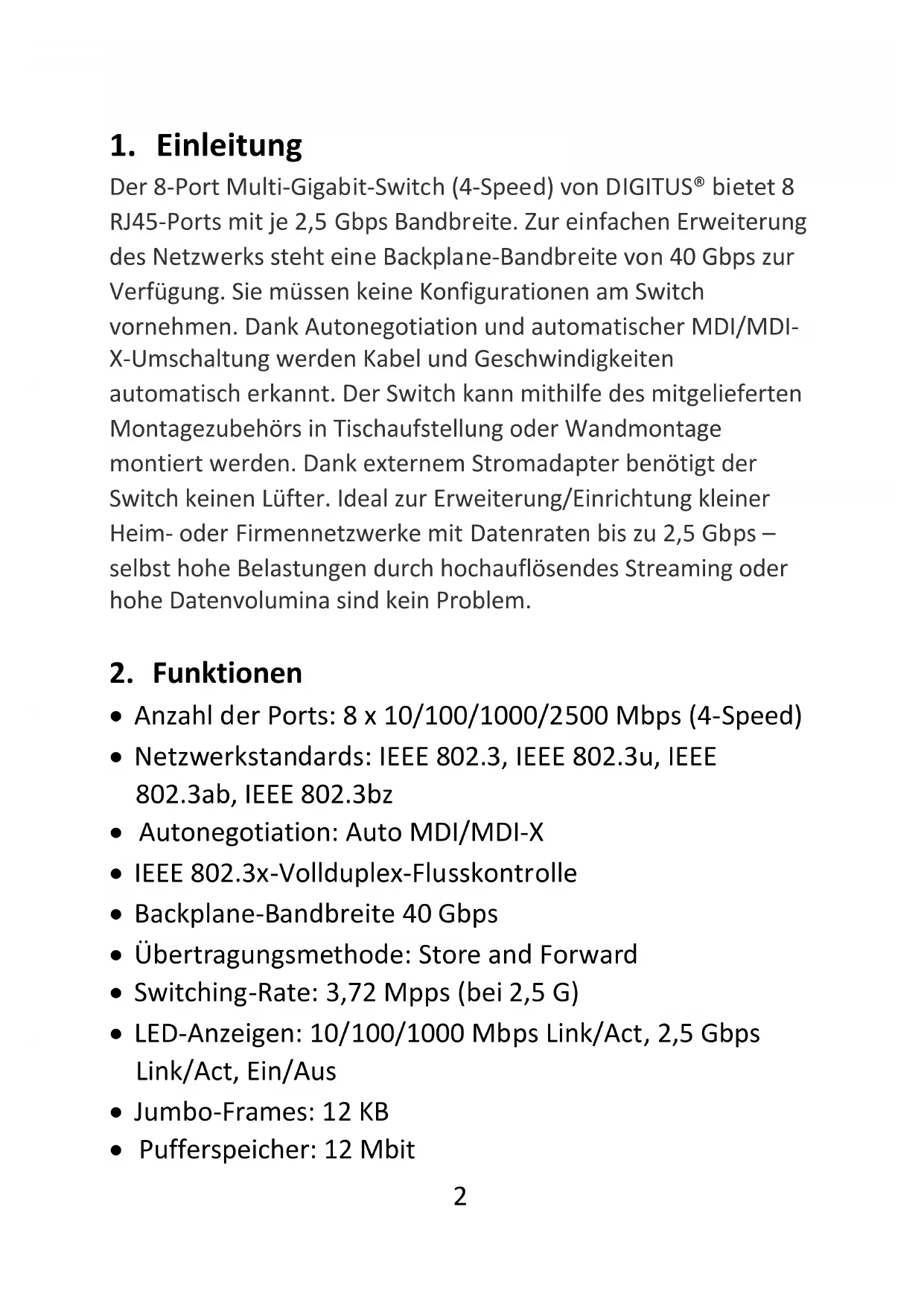 LAN-Port 8x RJ-45-Ports Weitere Ports 1x DC-Jack, 1x Reset-Schaltfläche LED-Anzeigen 8x G+G Stacked LEDs (2,5 G Link/Act, 1000/100/100 M Link/Act) 1x Grüne Ein/Aus-LED: Ethernet-Standard IEEE802.3: 100BASE-TX (802.3u) 1000BASE-T (802.3ab) 2.5G BASE-T (802.3bz) Link- Geschwindigkeit 100BASE-TX: 100 Mbps 1000Base-T: 1 Gbps 2.5G BASE-T: 2,5 Gbps Duplex Unterstützt Vollduplex und Halbduplex Autonegotiation Auf allen Ports unterstützt Auto MDI/MDI-X Auf allen Ports unterstützt Jumbo-Frames Unterstützt (über 9.216 Bytes) Switching-Typ Store and Forward Switching-Rate 100BASE-TX: 148.810 pps 1000BASE-T: 1.488.095 pps 2.5BASE-T: 3.720.238 pps Switching Fabric 40 Gbps Betriebstemperatur 0 °C - 45 °C Lagertemperatur -10 °C - 60 °C6 Feuchtigkeitsbereich ~ 90 % Maße (L x B x H) 190 x 120 x 30 mm Farbe Schwarz Lüfter Keiner (Kühlung durch Luftzirkulation ohne Lüfter) Ladeadapter 12 V / 1,8 A